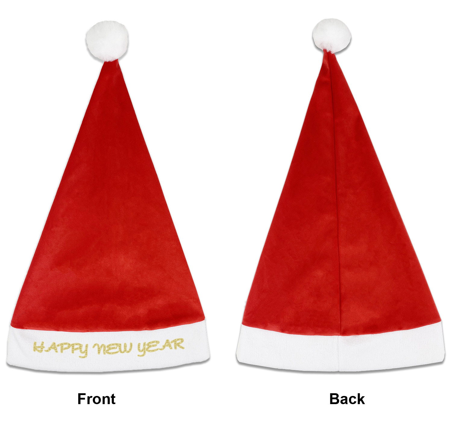 Our Santa hats are a soft, velvety polyester material. These customizable Santa hats are a classic red with white brimming and pom pom ball hanging off the hat tail just like Santa Claus! Each personalized Santa hat is approximately 17.5 L x 11.8 W. We offer two different styles to print your designs on the white brim - front or front & back.