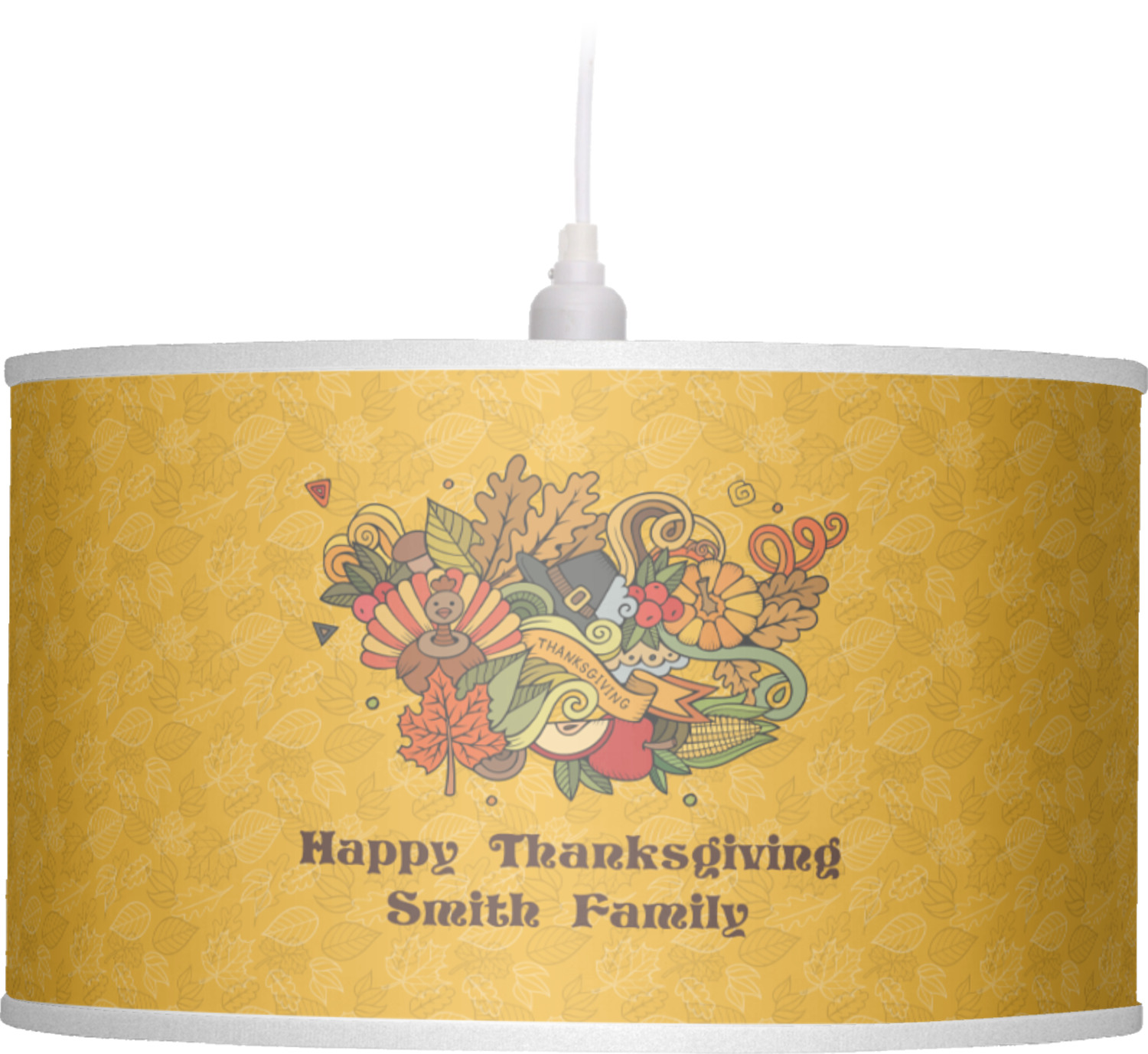 Happy Thanksgiving is a retro classic design with all the fall and thanksgiving elements. The background is two tones of leaves on a gold background and it features a hand drawn montage / collage of thanksgiving elements. We chose a retro font and personalized it with "Happy Thanksgiving" and "Smith Family" in a fall / thanksgiving dark brown from our fall/thanksgiving color palette.