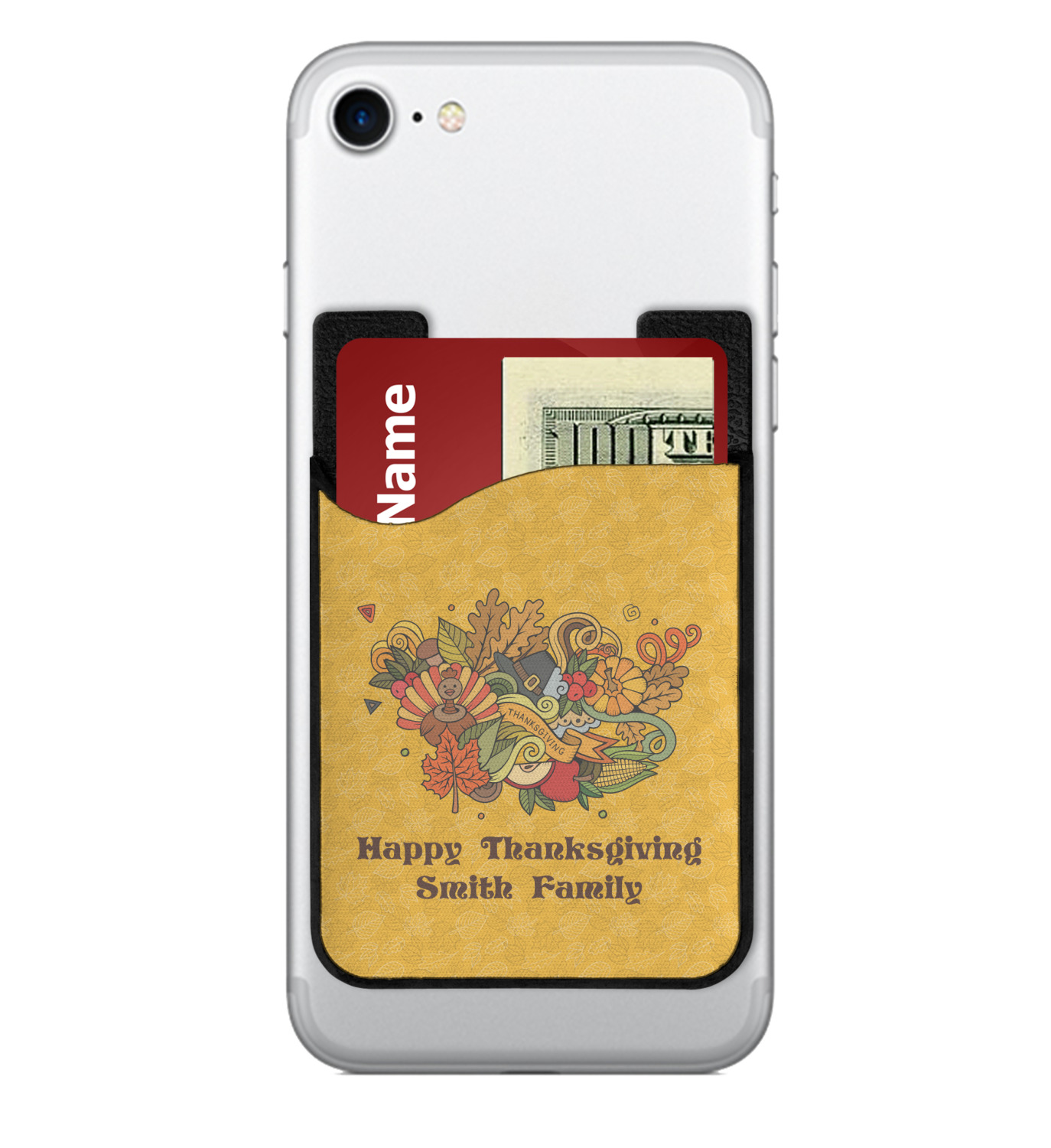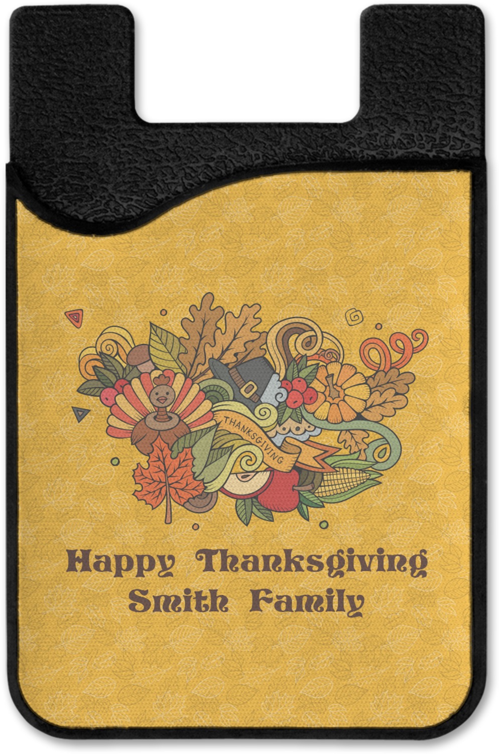 Happy Thanksgiving is a retro classic design with all the fall and thanksgiving elements. The background is two tones of leaves on a gold background and it features a hand drawn montage / collage of thanksgiving elements. We chose a retro font and personalized it with "Happy Thanksgiving" and "Smith Family" in a fall / thanksgiving dark brown from our fall/thanksgiving color palette.