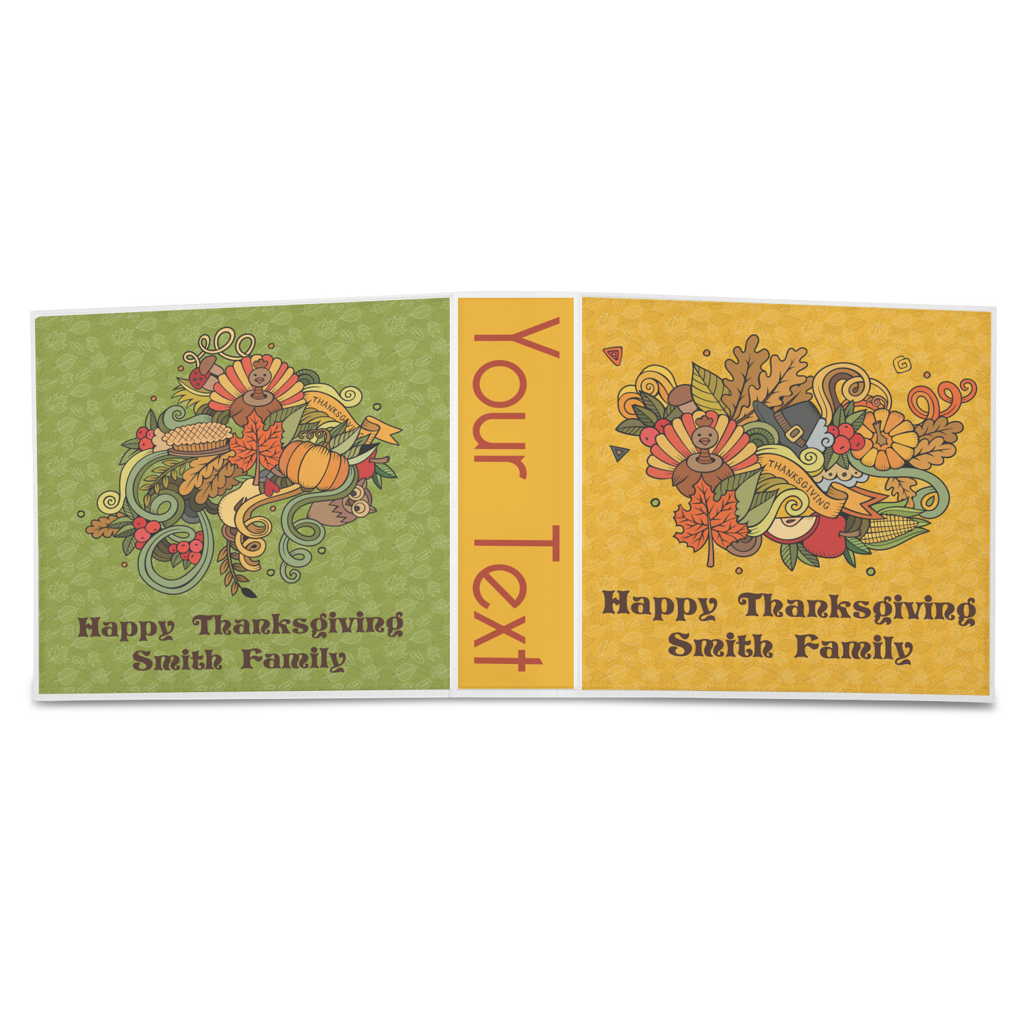 Happy Thanksgiving is a retro classic design with all the fall and thanksgiving elements. The background is two tones of leaves on a gold background and it features a hand drawn montage / collage of thanksgiving elements. We chose a retro font and personalized it with "Happy Thanksgiving" and "Smith Family" in a fall / thanksgiving dark brown from our fall/thanksgiving color palette.