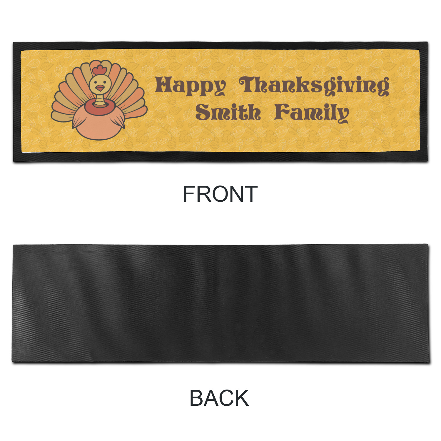 Happy Thanksgiving is a retro classic design with all the fall and thanksgiving elements. The background is two tones of leaves on a gold background and it features a hand drawn montage / collage of thanksgiving elements. We chose a retro font and personalized it with "Happy Thanksgiving" and "Smith Family" in a fall / thanksgiving dark brown from our fall/thanksgiving color palette.
