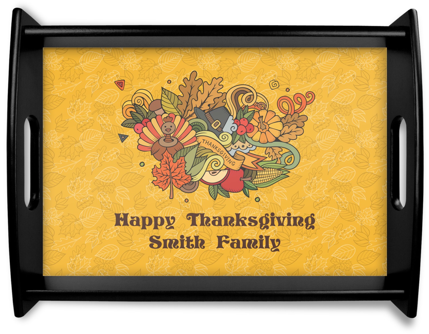 This serving tray with handles features square edges and two rounded sides, creating a very modern look. Each side is fabricated from a beautifully cut, natural wood. The bottom of the interior of the tray displays your customized design in bright, vibrant color. The tray is sold in both a black color and a natural wood look. Each variation of the wood serving tray has two sizes: Small, which is 14" x 10" x 2.25", and Large, which is 19.5" x 13.5" x 2.75".
