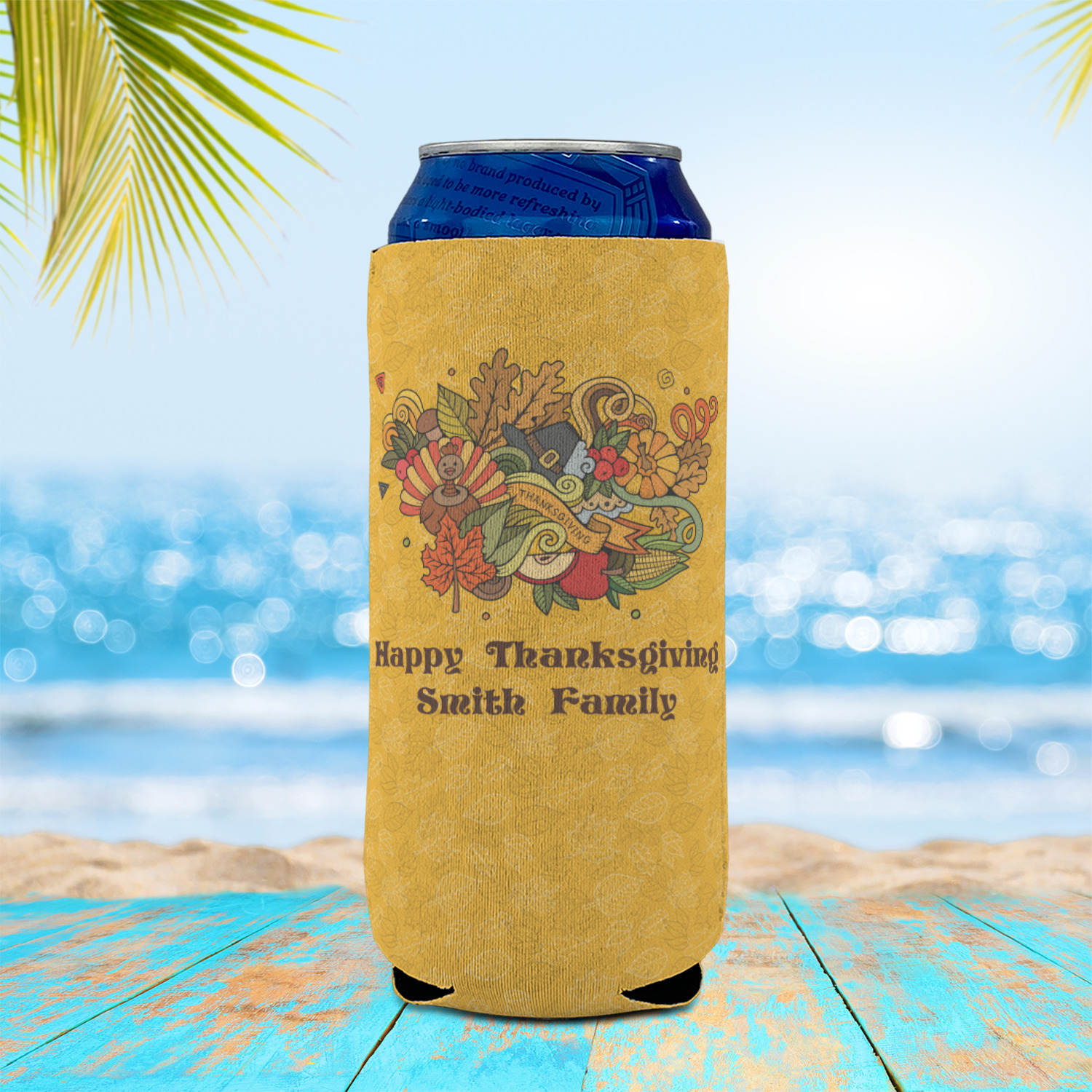 Happy Thanksgiving is a retro classic design with all the fall and thanksgiving elements. The background is two tones of leaves on a gold background and it features a hand drawn montage / collage of thanksgiving elements. We chose a retro font and personalized it with "Happy Thanksgiving" and "Smith Family" in a fall / thanksgiving dark brown from our fall/thanksgiving color palette.