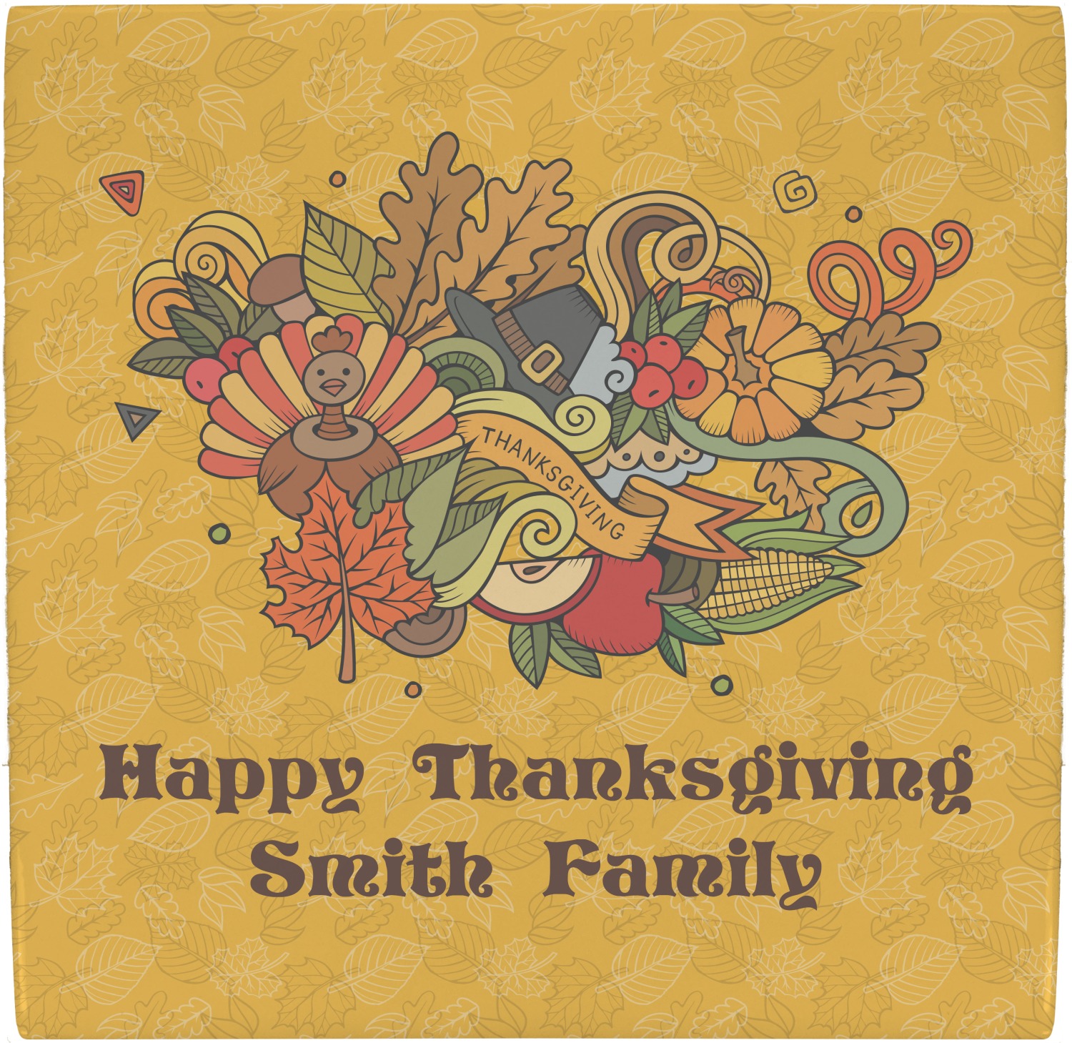 Happy Thanksgiving is a retro classic design with all the fall and thanksgiving elements. The background is two tones of leaves on a gold background and it features a hand drawn montage / collage of thanksgiving elements. We chose a retro font and personalized it with "Happy Thanksgiving" and "Smith Family" in a fall / thanksgiving dark brown from our fall/thanksgiving color palette.