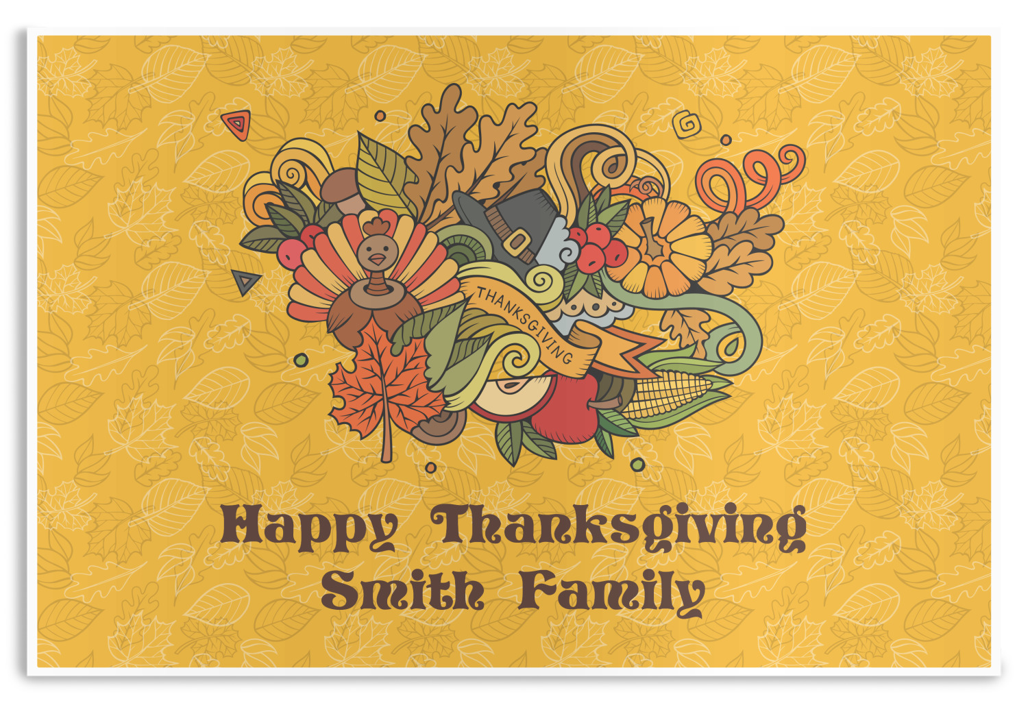 Happy Thanksgiving is a retro classic design with all the fall and thanksgiving elements. The background is two tones of leaves on a gold background and it features a hand drawn montage / collage of thanksgiving elements. We chose a retro font and personalized it with "Happy Thanksgiving" and "Smith Family" in a fall / thanksgiving dark brown from our fall/thanksgiving color palette.