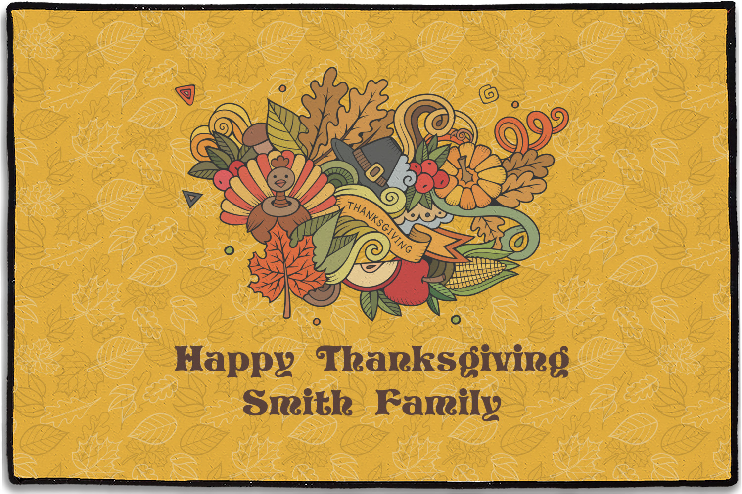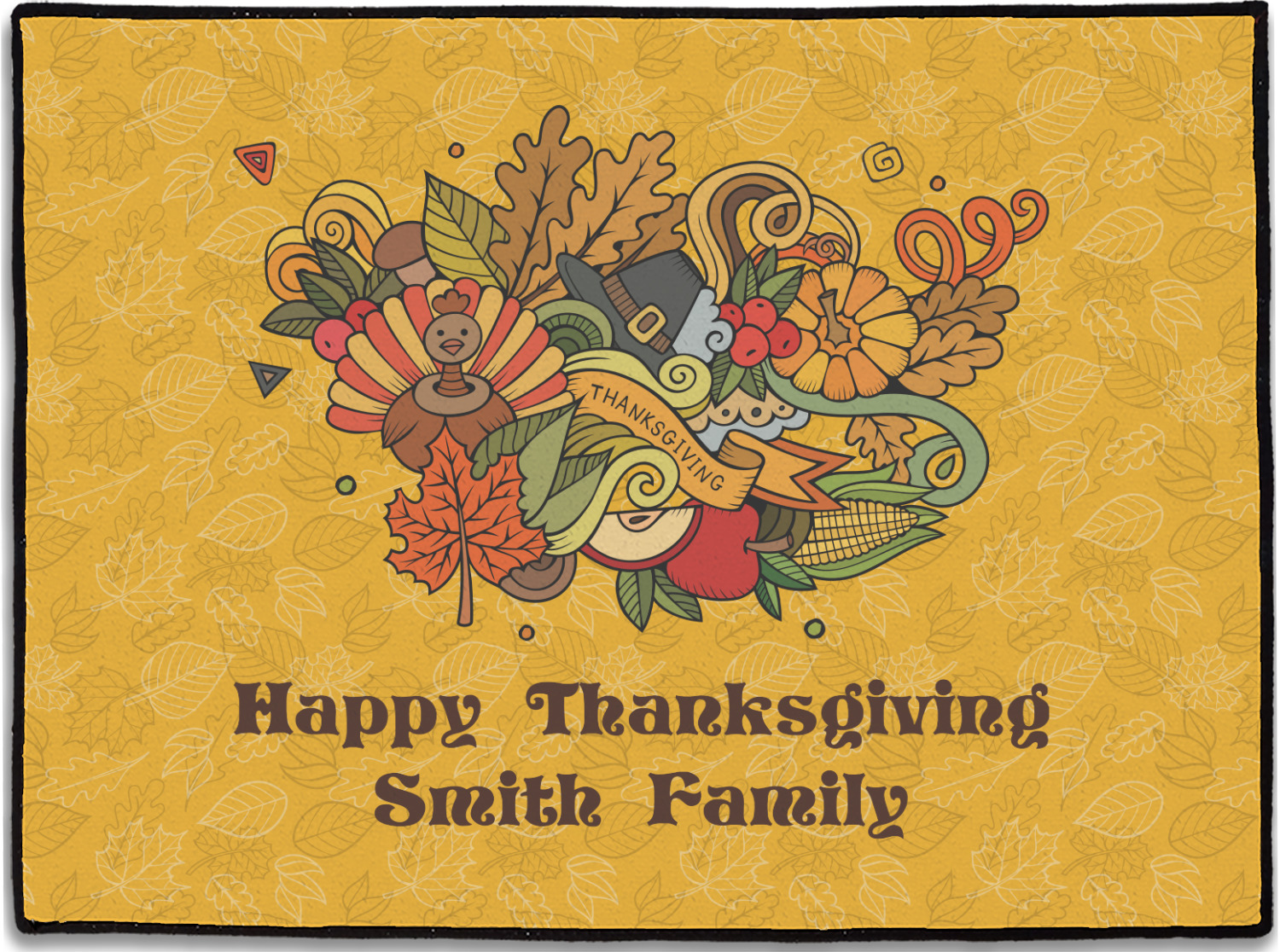 Happy Thanksgiving is a retro classic design with all the fall and thanksgiving elements. The background is two tones of leaves on a gold background and it features a hand drawn montage / collage of thanksgiving elements. We chose a retro font and personalized it with "Happy Thanksgiving" and "Smith Family" in a fall / thanksgiving dark brown from our fall/thanksgiving color palette.