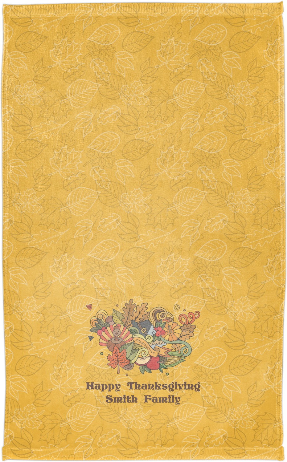 Happy Thanksgiving is a retro classic design with all the fall and thanksgiving elements. The background is two tones of leaves on a gold background and it features a hand drawn montage / collage of thanksgiving elements. We chose a retro font and personalized it with "Happy Thanksgiving" and "Smith Family" in a fall / thanksgiving dark brown from our fall/thanksgiving color palette.