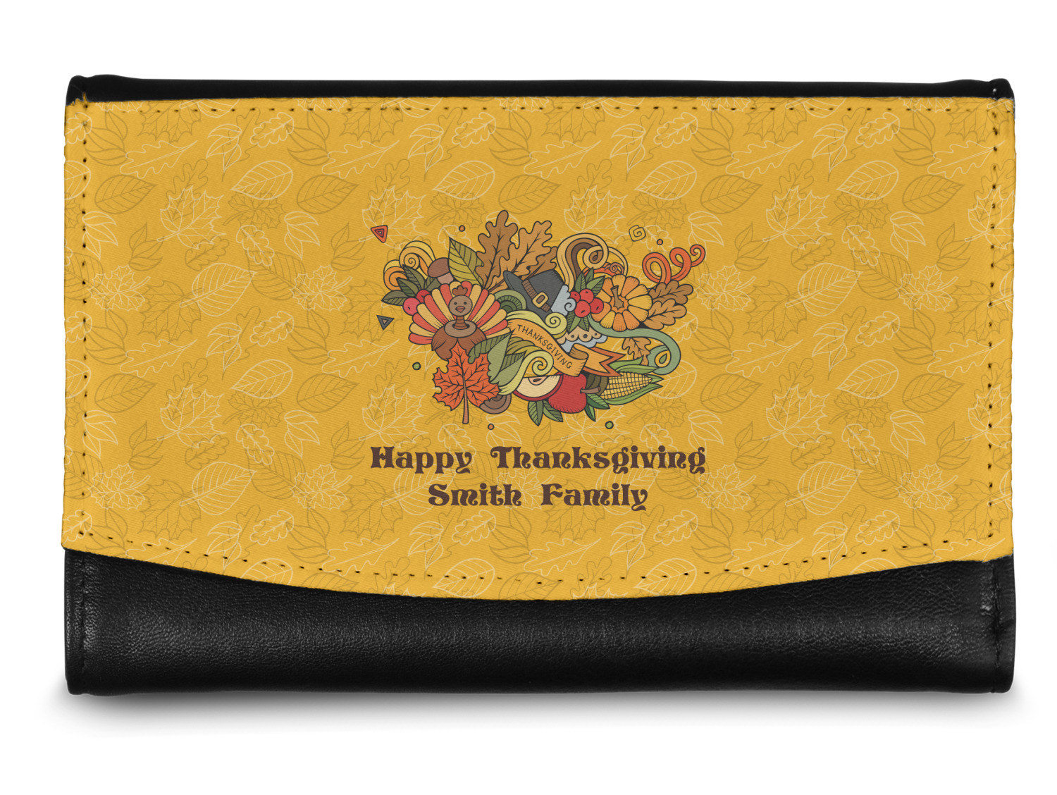 Happy Thanksgiving is a retro classic design with all the fall and thanksgiving elements. The background is two tones of leaves on a gold background and it features a hand drawn montage / collage of thanksgiving elements. We chose a retro font and personalized it with "Happy Thanksgiving" and "Smith Family" in a fall / thanksgiving dark brown from our fall/thanksgiving color palette.