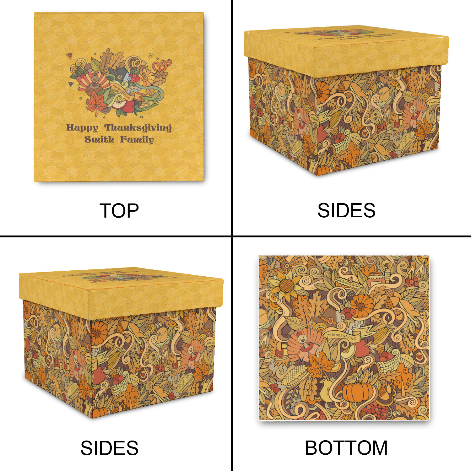 Happy Thanksgiving is a retro classic design with all the fall and thanksgiving elements. The background is two tones of leaves on a gold background and it features a hand drawn montage / collage of thanksgiving elements. We chose a retro font and personalized it with "Happy Thanksgiving" and "Smith Family" in a fall / thanksgiving dark brown from our fall/thanksgiving color palette.