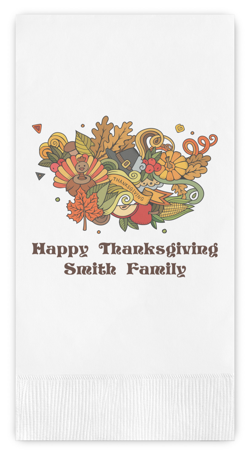 Happy Thanksgiving is a retro classic design with all the fall and thanksgiving elements. The background is two tones of leaves on a gold background and it features a hand drawn montage / collage of thanksgiving elements. We chose a retro font and personalized it with "Happy Thanksgiving" and "Smith Family" in a fall / thanksgiving dark brown from our fall/thanksgiving color palette.