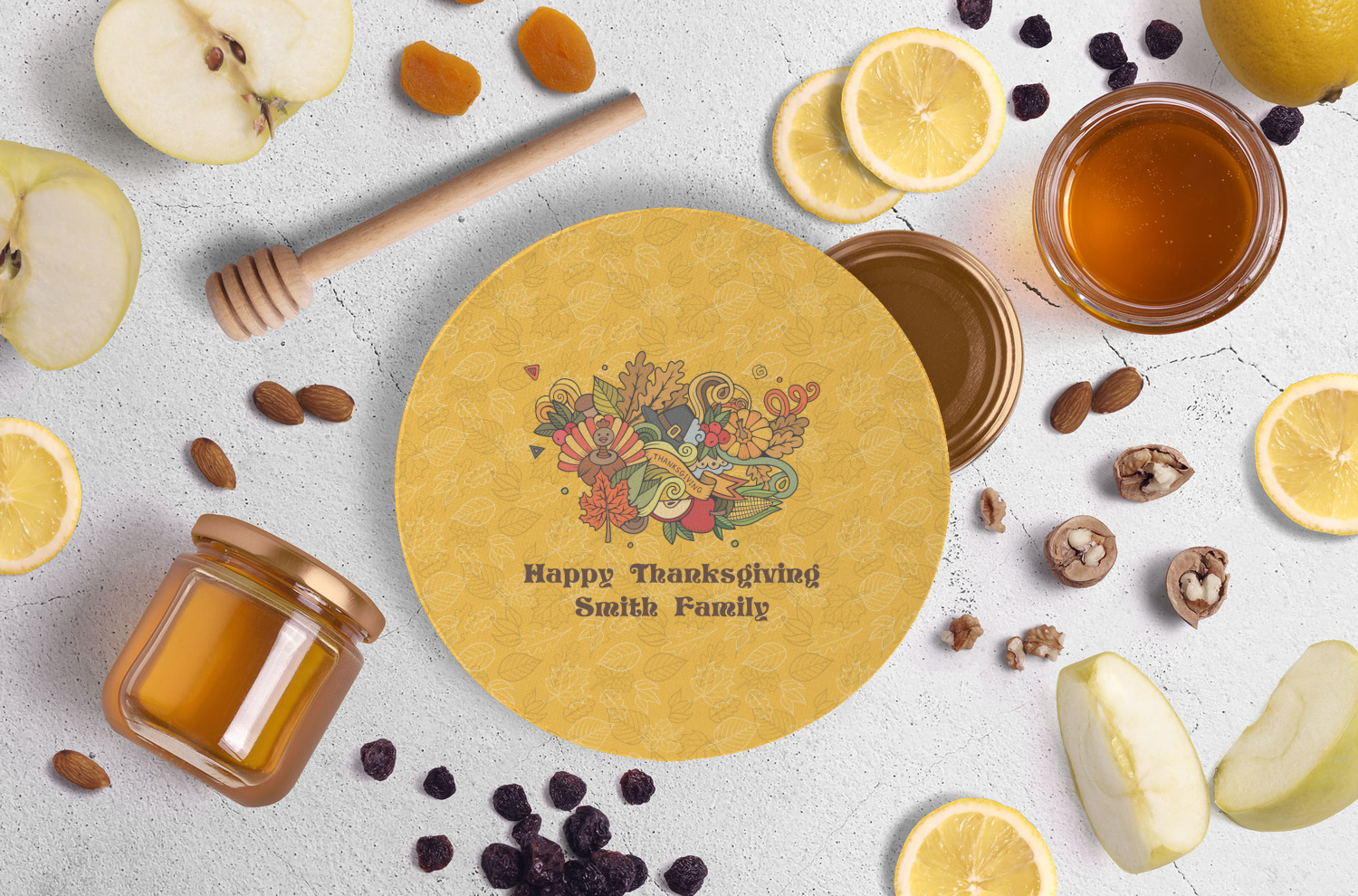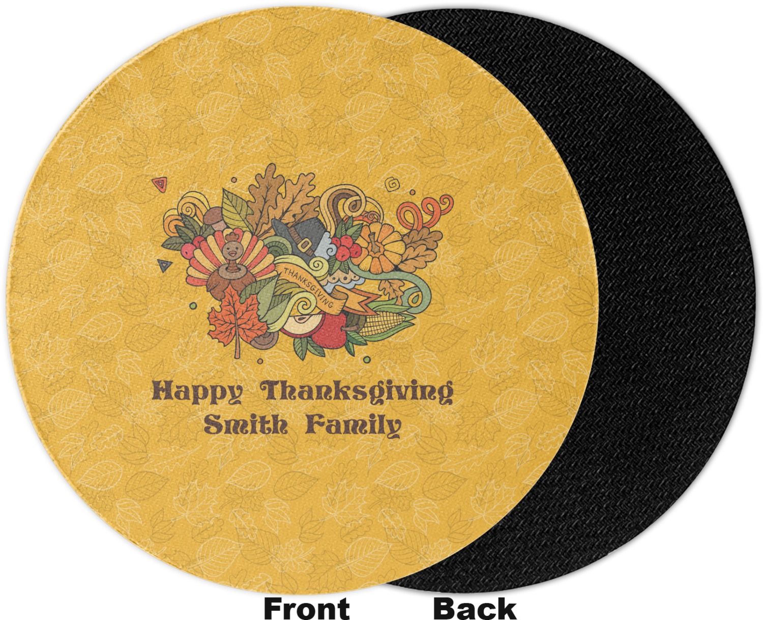 Happy Thanksgiving is a retro classic design with all the fall and thanksgiving elements. The background is two tones of leaves on a gold background and it features a hand drawn montage / collage of thanksgiving elements. We chose a retro font and personalized it with "Happy Thanksgiving" and "Smith Family" in a fall / thanksgiving dark brown from our fall/thanksgiving color palette.