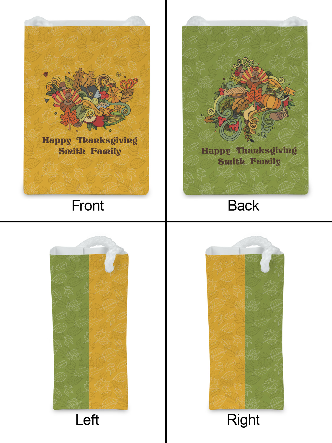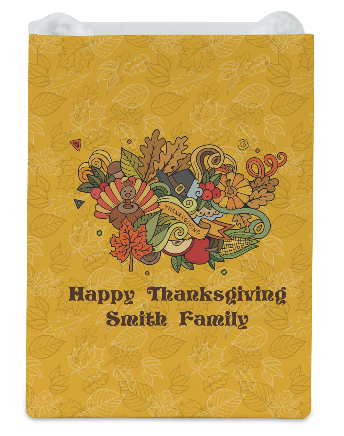 Happy Thanksgiving is a retro classic design with all the fall and thanksgiving elements. The background is two tones of leaves on a gold background and it features a hand drawn montage / collage of thanksgiving elements. We chose a retro font and personalized it with "Happy Thanksgiving" and "Smith Family" in a fall / thanksgiving dark brown from our fall/thanksgiving color palette.