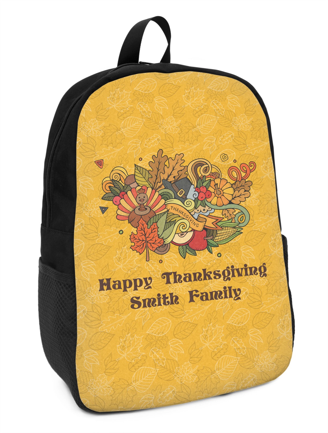 These small backpacks are made of a durable black canvas material with your personalization right on the front. The two shoulder straps are padded and easily adjustable. The bag itself measures at about 11" W x 15" H x 5" D. It's the perfect size for elementary aged kids or adults who want a smaller backpack. On the top of the bag you will find a handle to hang or carry your backpack by as well as a large zipper closure to keep all of your belongings safe inside. On each side of your backpack is a mesh pocket for a small item or water bottle. Inside your backpack you will find a spacious area with a small zipper pocket and a padded laptop slot that will fit up to a 13" laptop (13" being very snug). This is the perfect bag for any student that needs a couple books and their laptop with them at all times. It also works great as a carry on for traveling!