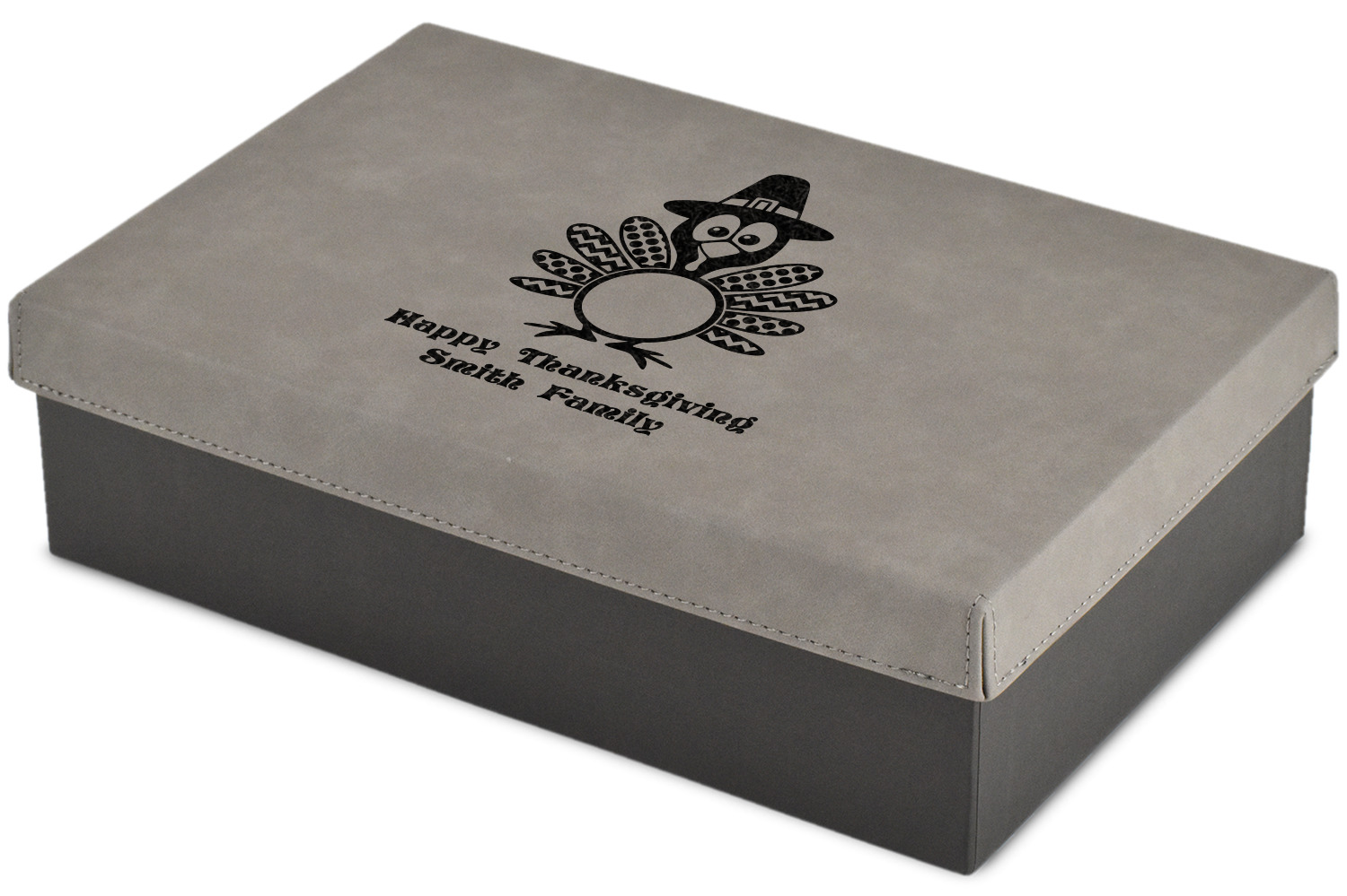 These gift boxes are available in 3 different sizes to accommodate various sized gifts. Available in gray as a neutral color for any occasion as well as to showcase your design boldly. Engraved with a laser this high quality paper board and faux leather gift box is unique and makes any gift stand out.
