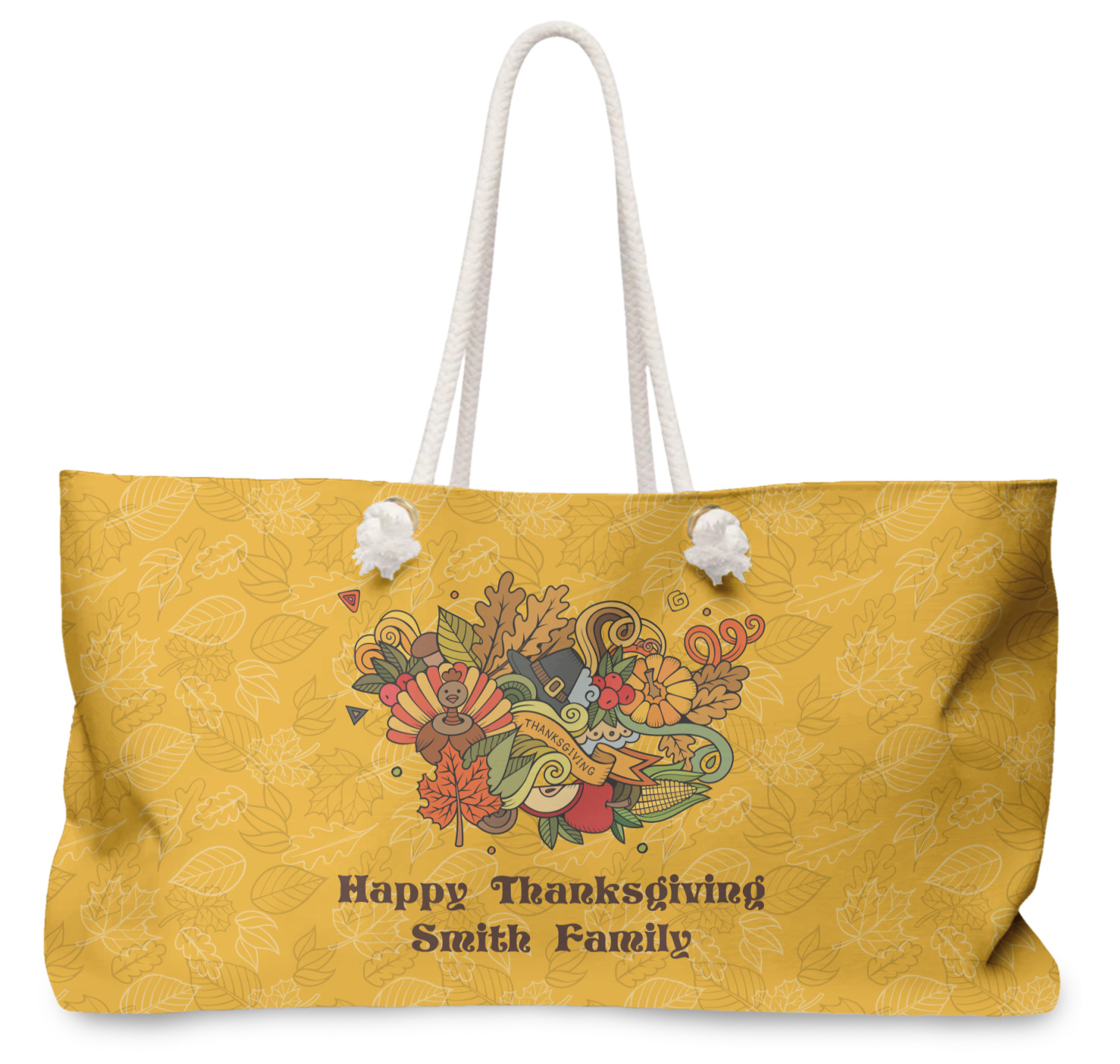 Our oversized weekender tote with rope handles is perfect for your weekend at the beach or on the town. This large tote are 24" W X 13" H, with a 5" gusset and a 27" thick rope handles with a knot that is put through a grommeted brass hole.