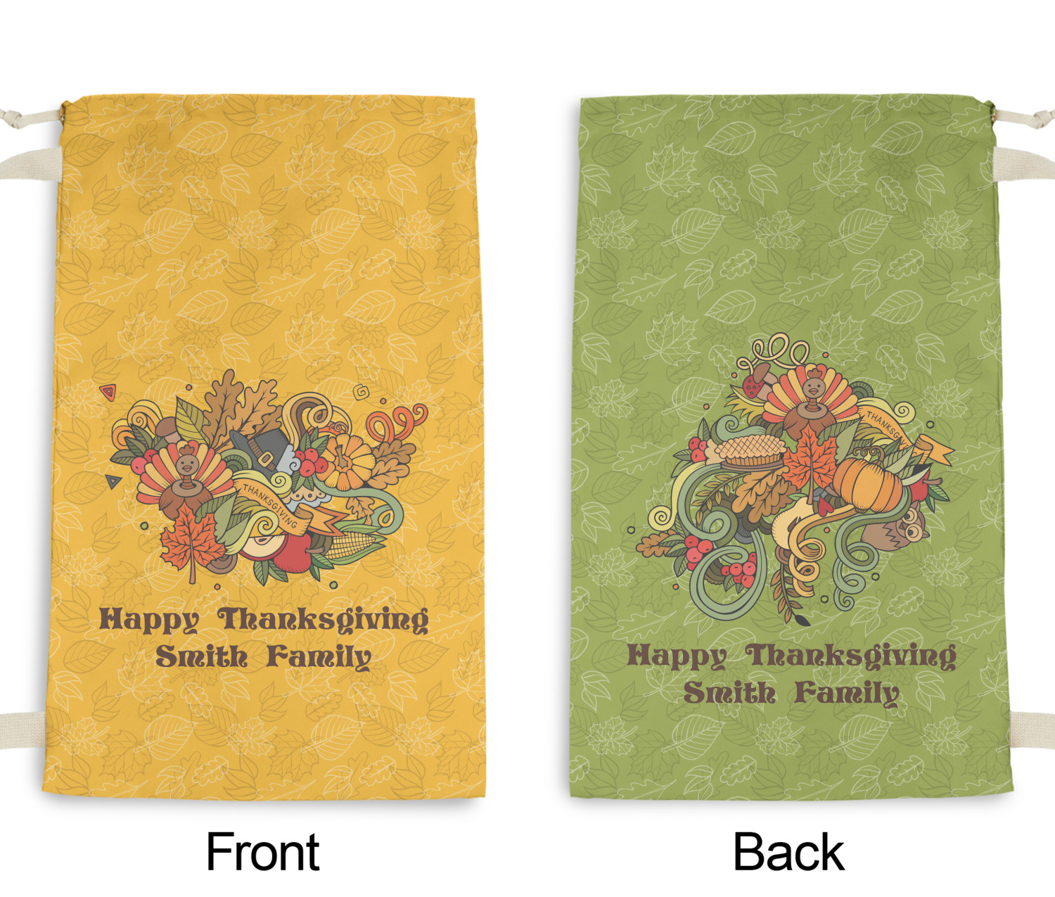 Happy Thanksgiving is a retro classic design with all the fall and thanksgiving elements. The background is two tones of leaves on a gold background and it features a hand drawn montage / collage of thanksgiving elements. We chose a retro font and personalized it with "Happy Thanksgiving" and "Smith Family" in a fall / thanksgiving dark brown from our fall/thanksgiving color palette.
