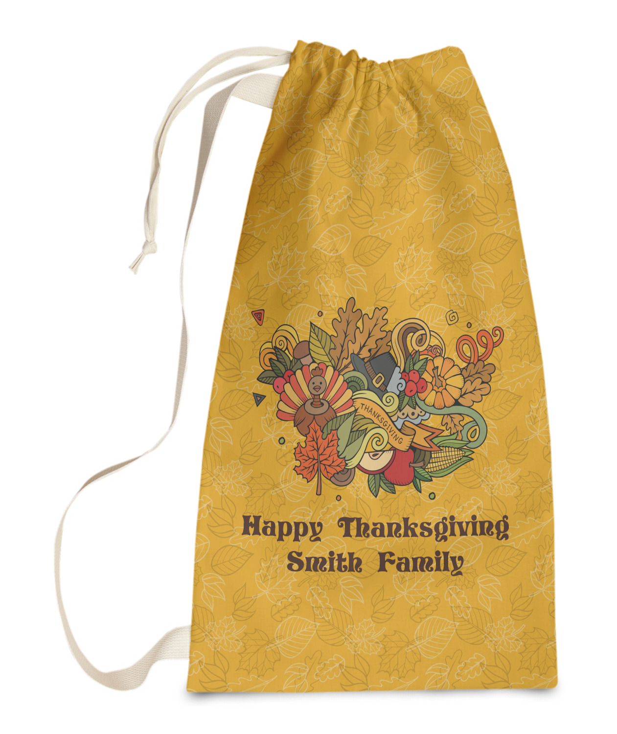 Carry your laundry in style with these customized laundry bags. Available in two sizes, featuring a natural colored woven strap and a cinch cord, these bags hold a lot of clothes or anything else you want to fit in them.