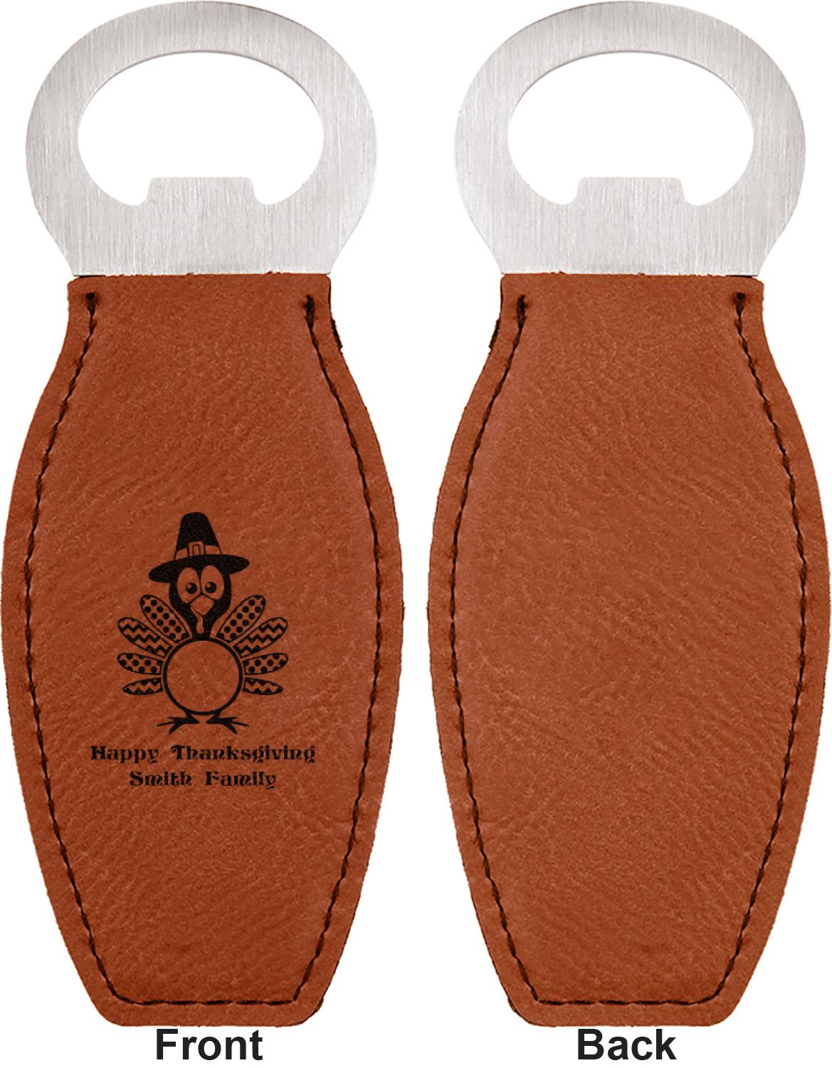 Built from stainless steel, these custom bottle openers are wrapped in a cognac-colored leatherette. Sharp, black stitching lines the edges for extra durability and a finished touch. Your personalization is laser-engraved onto the surface of this leatherette, leaving behind a crisp, black coloration. At 4.6 by 1.8 inches, this beer bottle opener gives you much of leverage when trying to open a stubborn bottle. On the opposite end of the opener, you'll find a magnet that you can use to display your new, unique bottle opener!