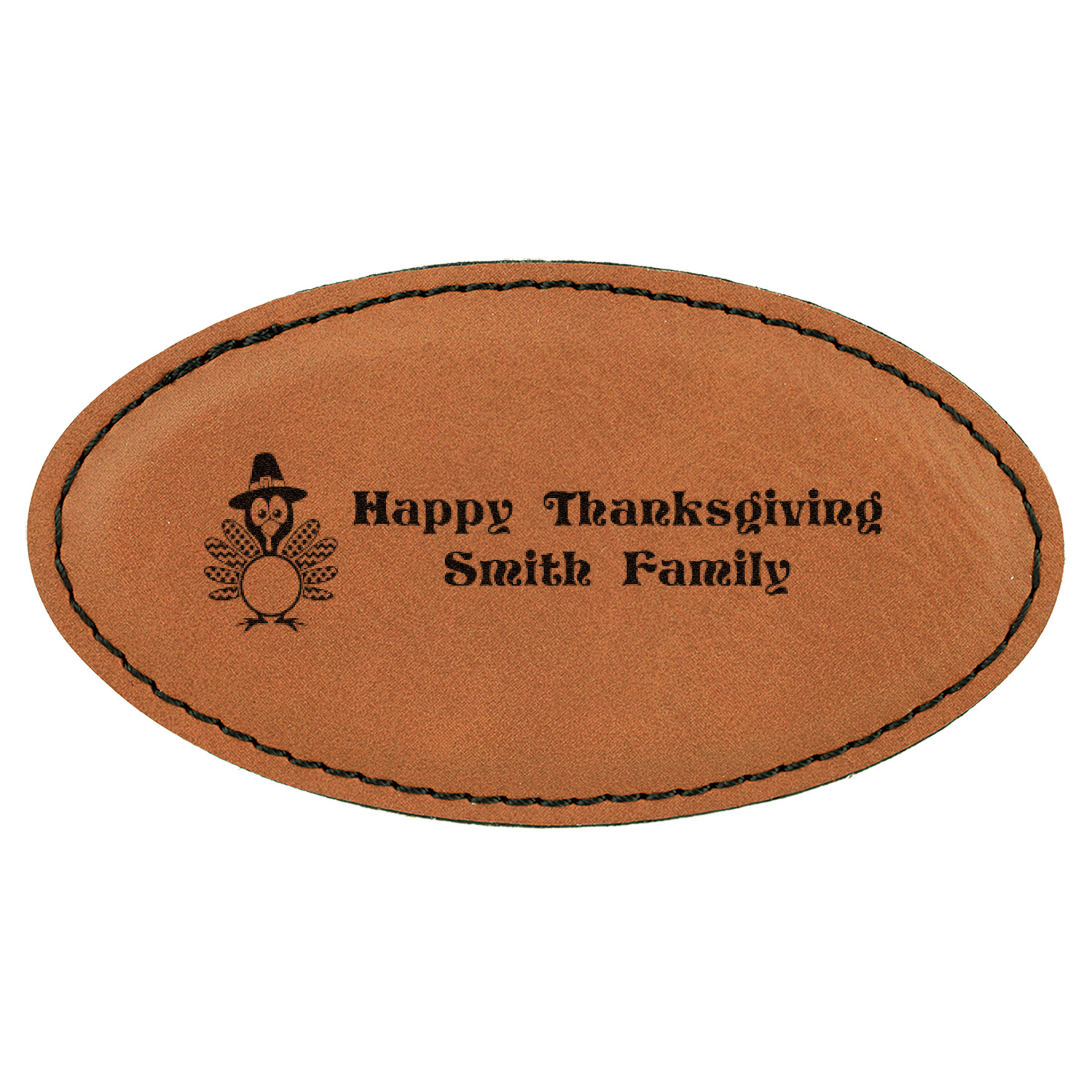 Made from a cognac-brown leatherette into an oval shape, these custom name badges measure at around 3.25" x 1.75". To add the suave appearance of this custom badge, a fine black stitching lines the edges or the badge itself. Your customized design is laser-engraved onto the surface of the leatherette. Accompanying your purchase is a removable magnet strip that can be used to secure the engraved name tag to any shirt, dress, or jacket.