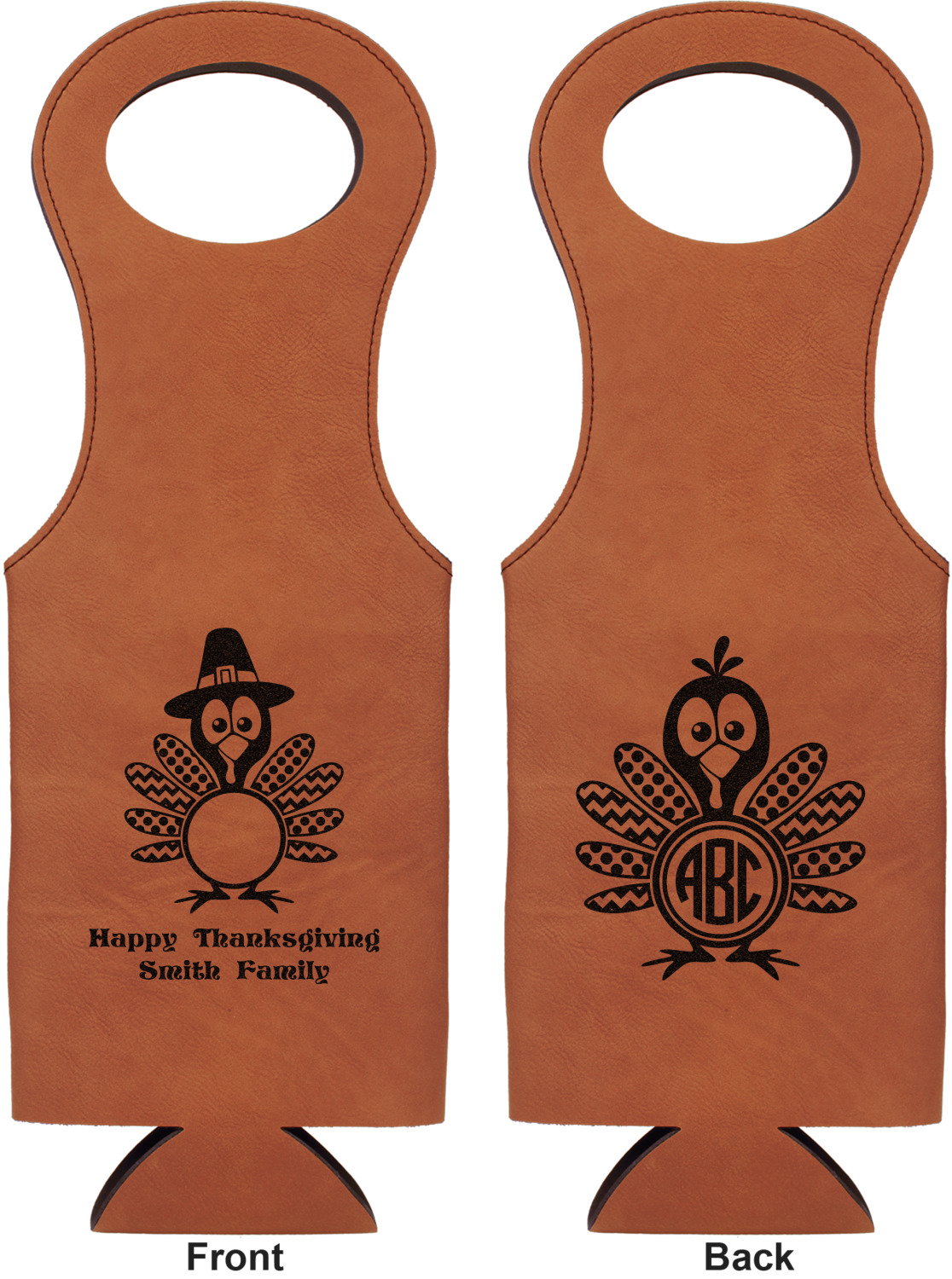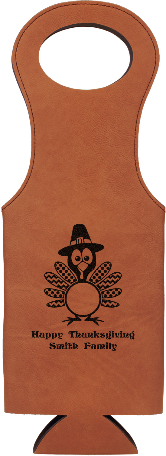 This wine carrier is made from a stunning leatherette, in a cognac-brown color. Strong, black stitching lines the sides of your wine bottle bag and provides extra durability. The interior is lined with a padded, black material to allow for a snug fit once your bottle is placed inside. At the top of this wine gift bag, you'll find two oval shaped handles that elegantly complements the rest of the bag's style. We provide you with the option of laser-engraving the front, or the front and back of your new personalized wine bag!