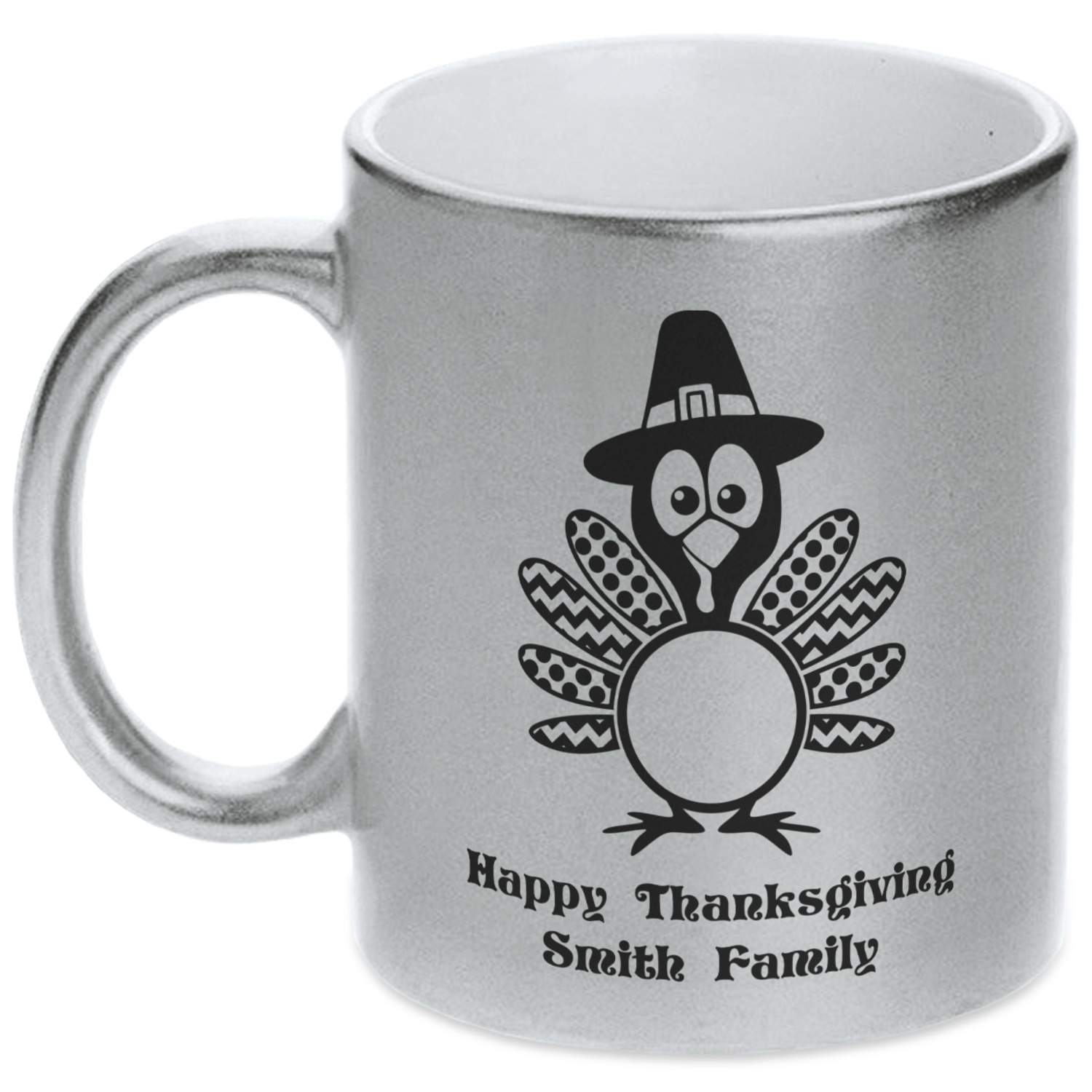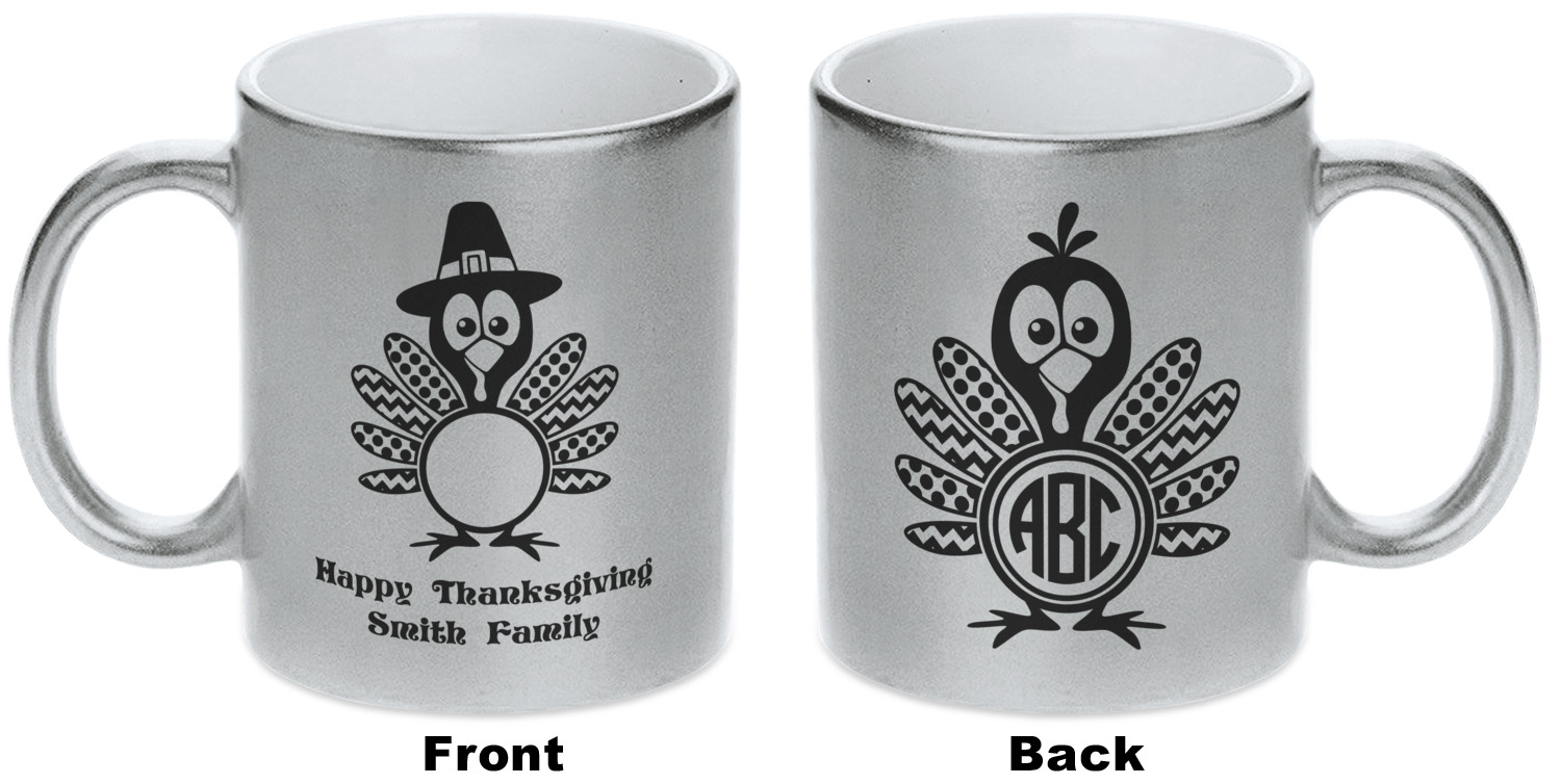 Our custom mugs are ceramic, which is great for keeping your tea or coffee warm! We offer two metallic mugs to personalize - Silver or Gold. Both styles hold around 11oz and have dimensions of approximately 3.75" x 3.5" x 4.75". Both the metallic mugs come in a matte finish and have glitter detailing to add a more pristine feel to the gold and silver base colors.