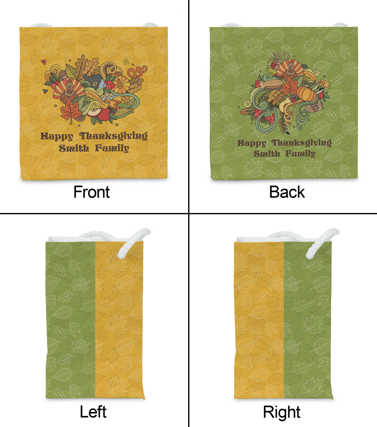 Happy Thanksgiving is a retro classic design with all the fall and thanksgiving elements. The background is two tones of leaves on a gold background and it features a hand drawn montage / collage of thanksgiving elements. We chose a retro font and personalized it with "Happy Thanksgiving" and "Smith Family" in a fall / thanksgiving dark brown from our fall/thanksgiving color palette.