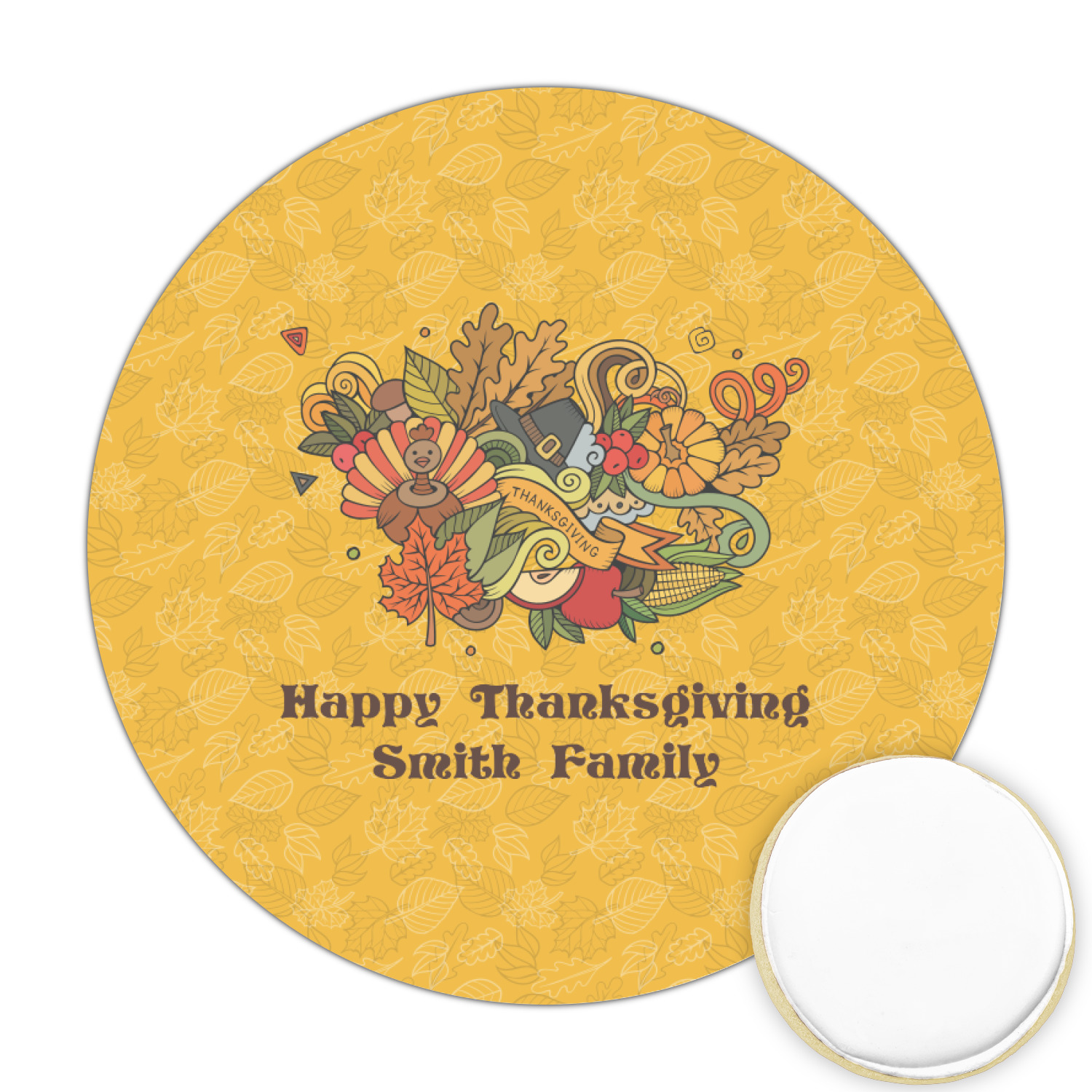 Happy Thanksgiving is a retro classic design with all the fall and thanksgiving elements. The background is two tones of leaves on a gold background and it features a hand drawn montage / collage of thanksgiving elements. We chose a retro font and personalized it with "Happy Thanksgiving" and "Smith Family" in a fall / thanksgiving dark brown from our fall/thanksgiving color palette.