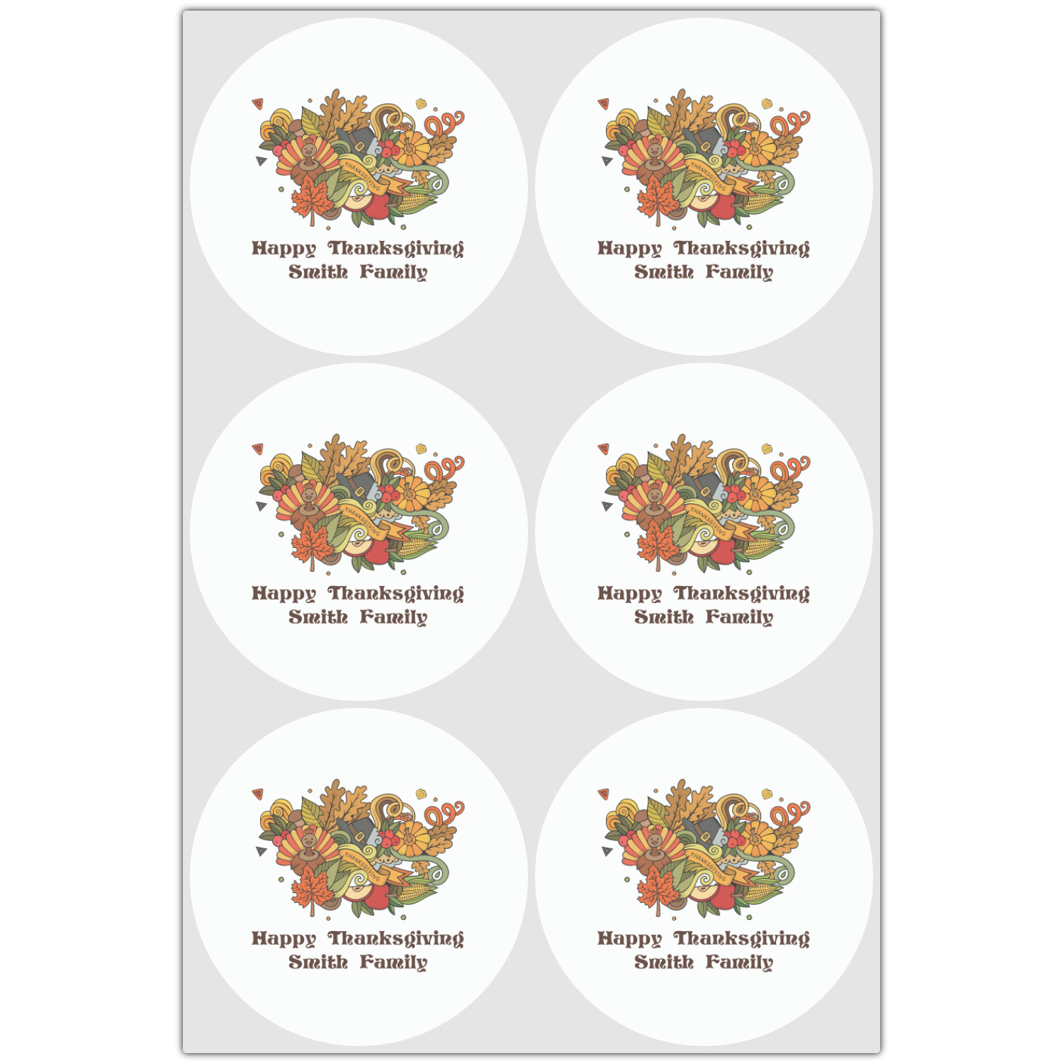 Happy Thanksgiving is a retro classic design with all the fall and thanksgiving elements. The background is two tones of leaves on a gold background and it features a hand drawn montage / collage of thanksgiving elements. We chose a retro font and personalized it with "Happy Thanksgiving" and "Smith Family" in a fall / thanksgiving dark brown from our fall/thanksgiving color palette.