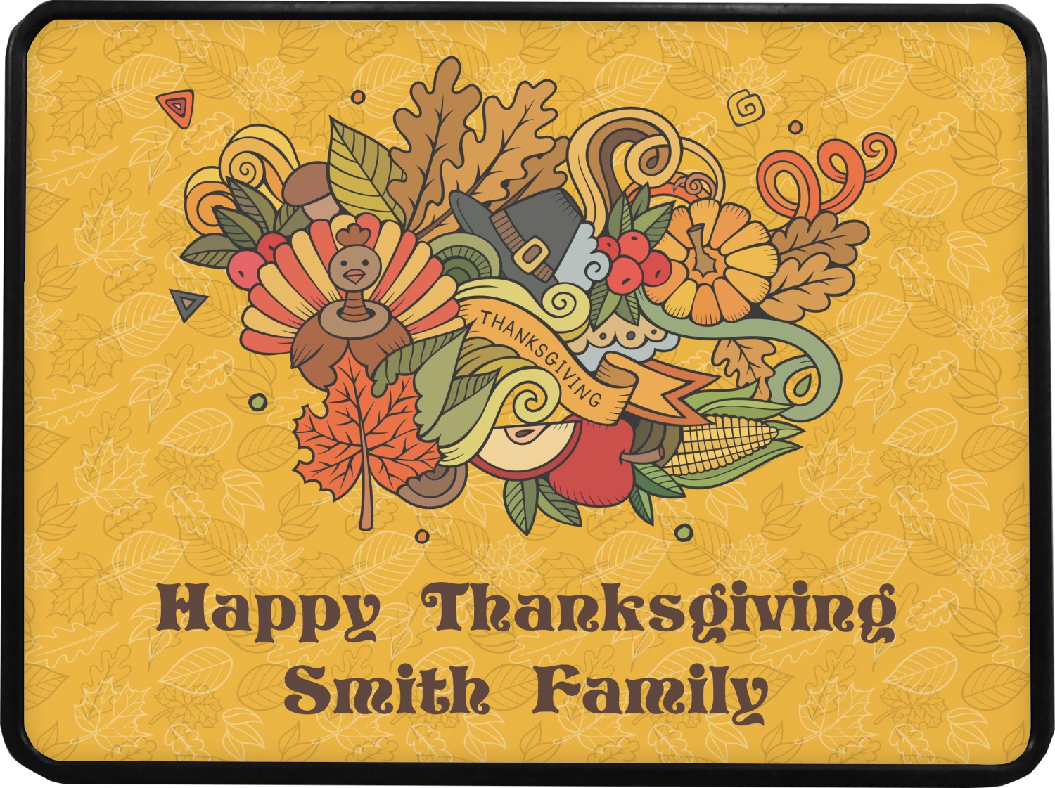 Happy Thanksgiving is a retro classic design with all the fall and thanksgiving elements. The background is two tones of leaves on a gold background and it features a hand drawn montage / collage of thanksgiving elements. We chose a retro font and personalized it with "Happy Thanksgiving" and "Smith Family" in a fall / thanksgiving dark brown from our fall/thanksgiving color palette.