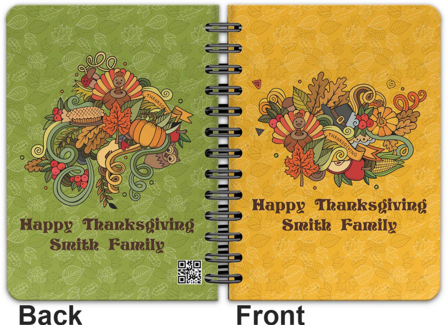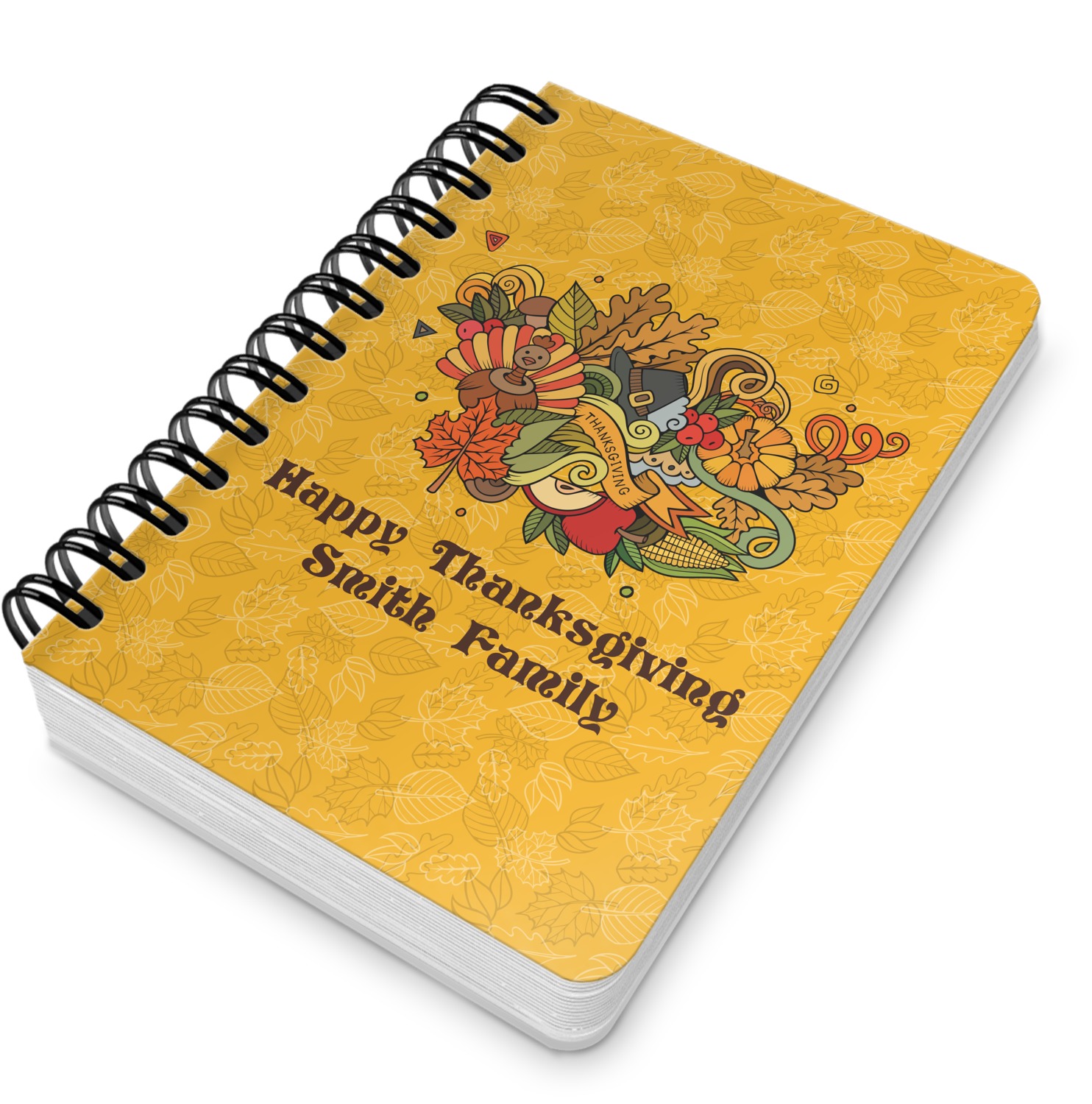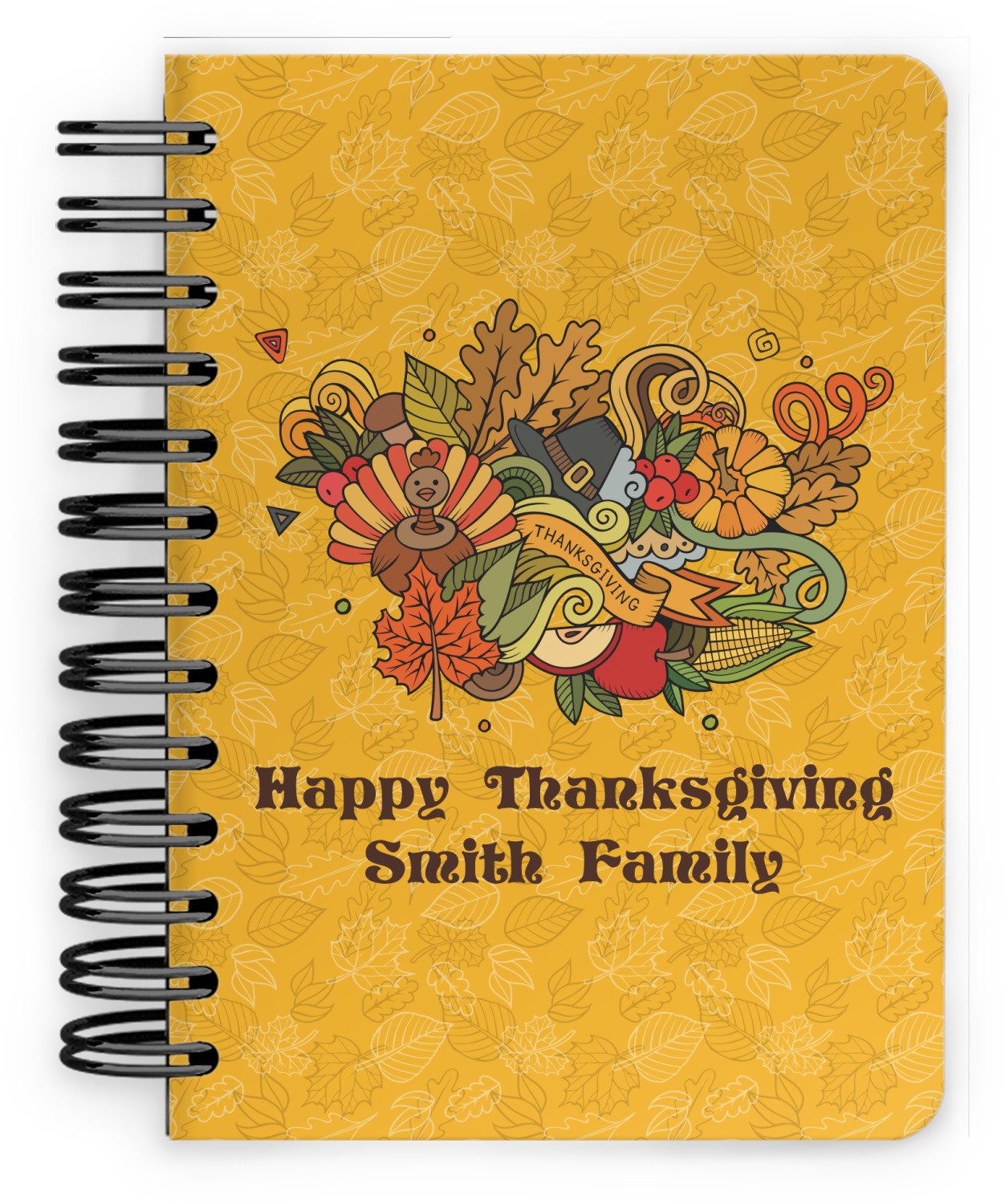 Happy Thanksgiving is a retro classic design with all the fall and thanksgiving elements. The background is two tones of leaves on a gold background and it features a hand drawn montage / collage of thanksgiving elements. We chose a retro font and personalized it with "Happy Thanksgiving" and "Smith Family" in a fall / thanksgiving dark brown from our fall/thanksgiving color palette.