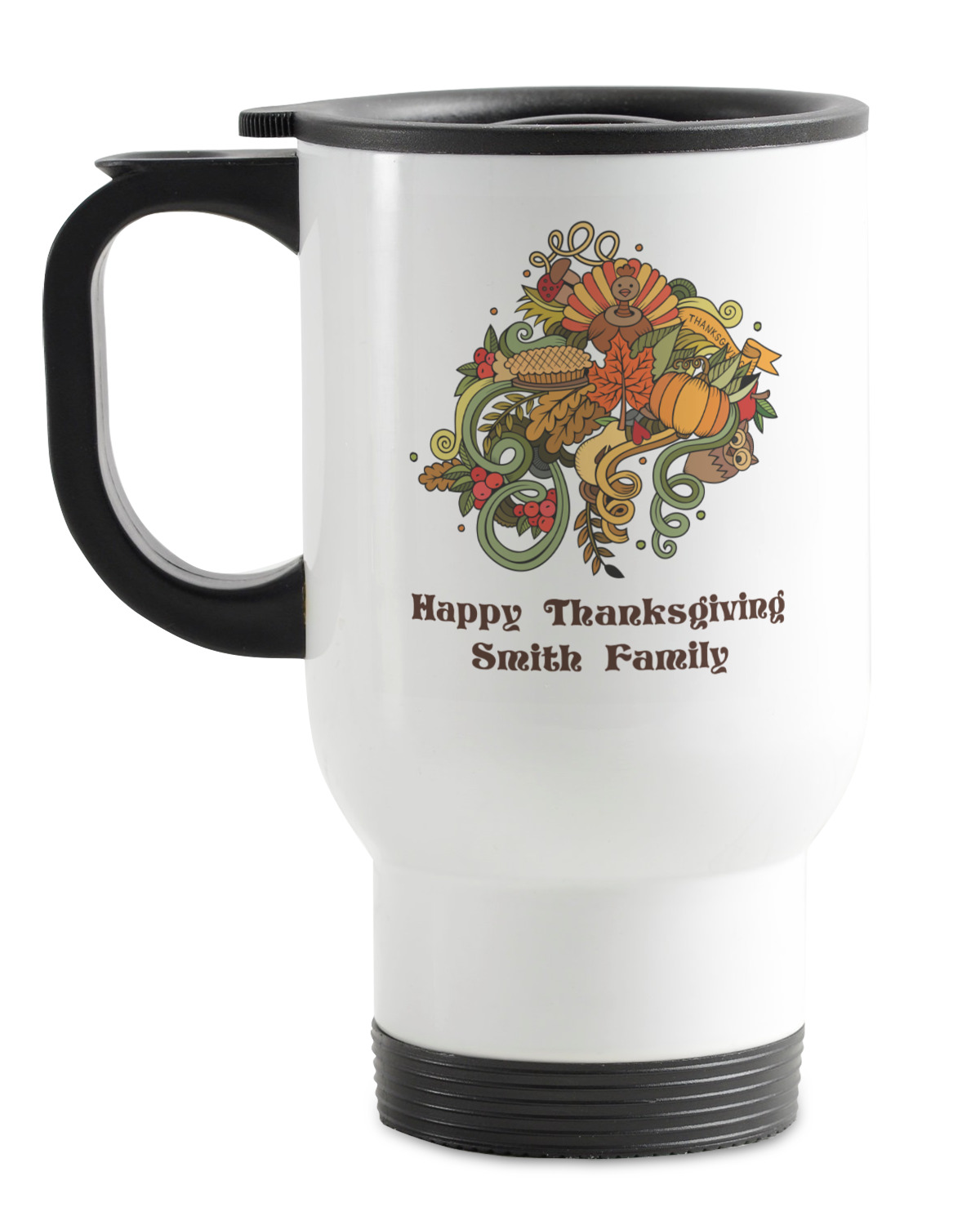 Happy Thanksgiving is a retro classic design with all the fall and thanksgiving elements. The background is two tones of leaves on a gold background and it features a hand drawn montage / collage of thanksgiving elements. We chose a retro font and personalized it with "Happy Thanksgiving" and "Smith Family" in a fall / thanksgiving dark brown from our fall/thanksgiving color palette.