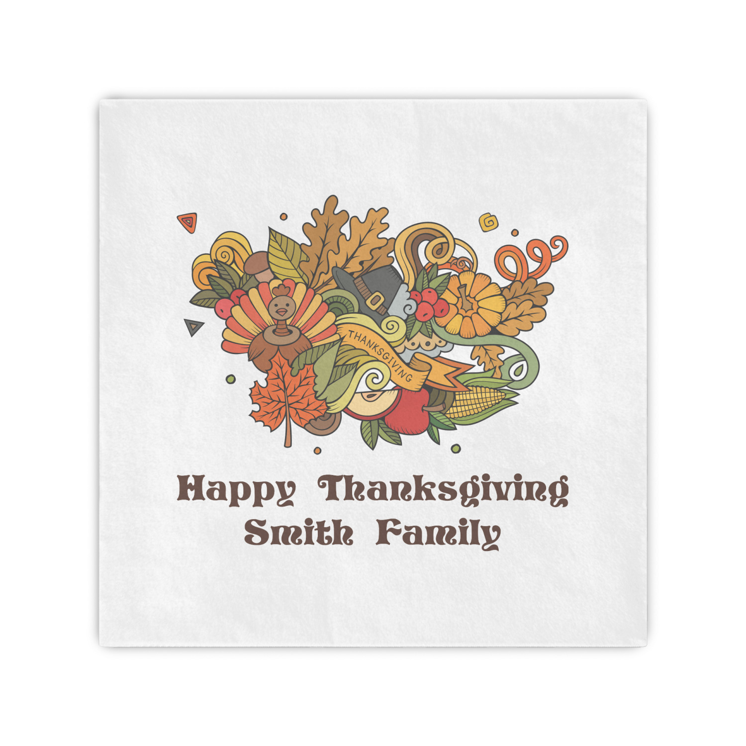Happy Thanksgiving is a retro classic design with all the fall and thanksgiving elements. The background is two tones of leaves on a gold background and it features a hand drawn montage / collage of thanksgiving elements. We chose a retro font and personalized it with "Happy Thanksgiving" and "Smith Family" in a fall / thanksgiving dark brown from our fall/thanksgiving color palette.