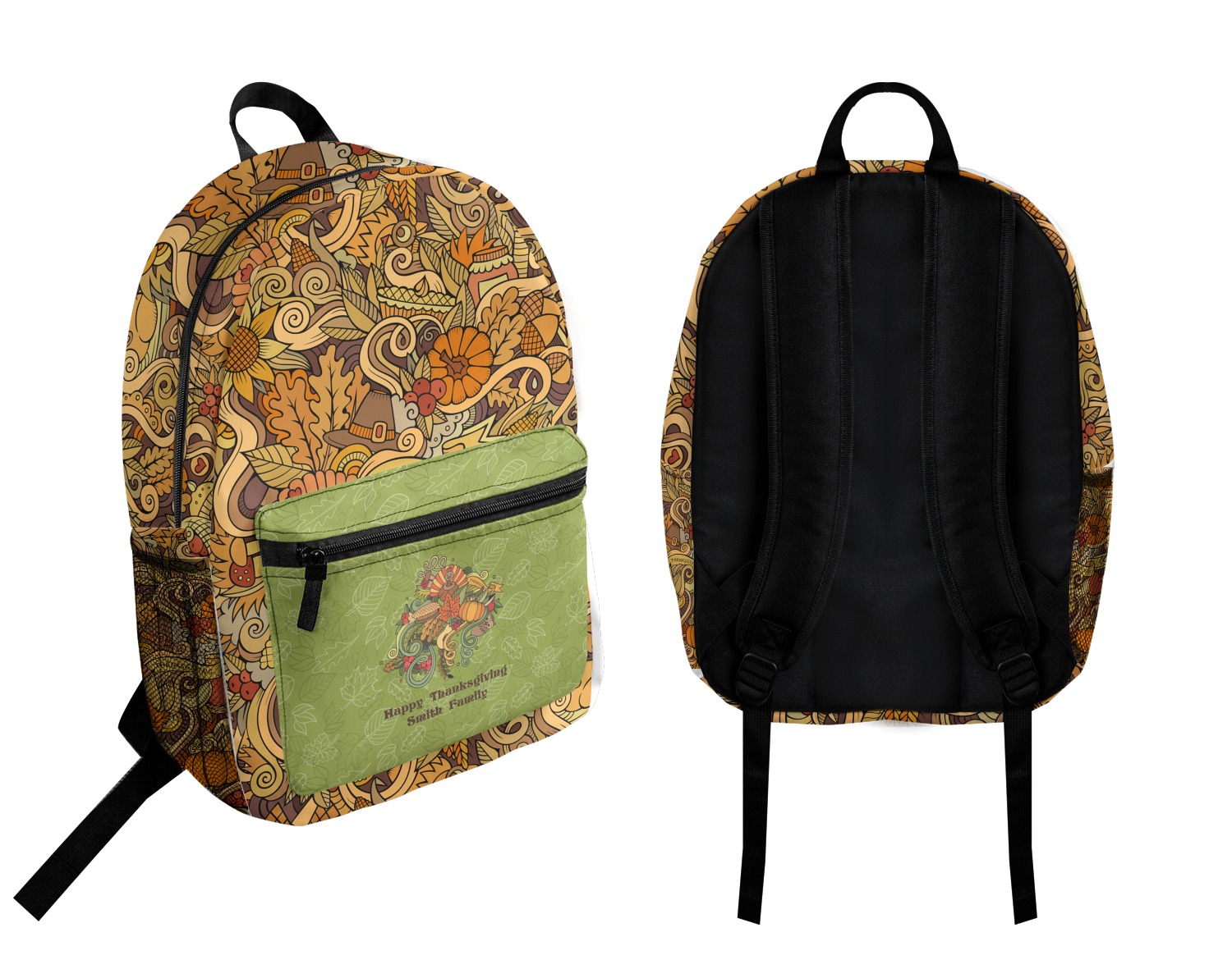 Happy Thanksgiving is a retro classic design with all the fall and thanksgiving elements. The background is two tones of leaves on a gold background and it features a hand drawn montage / collage of thanksgiving elements. We chose a retro font and personalized it with "Happy Thanksgiving" and "Smith Family" in a fall / thanksgiving dark brown from our fall/thanksgiving color palette.