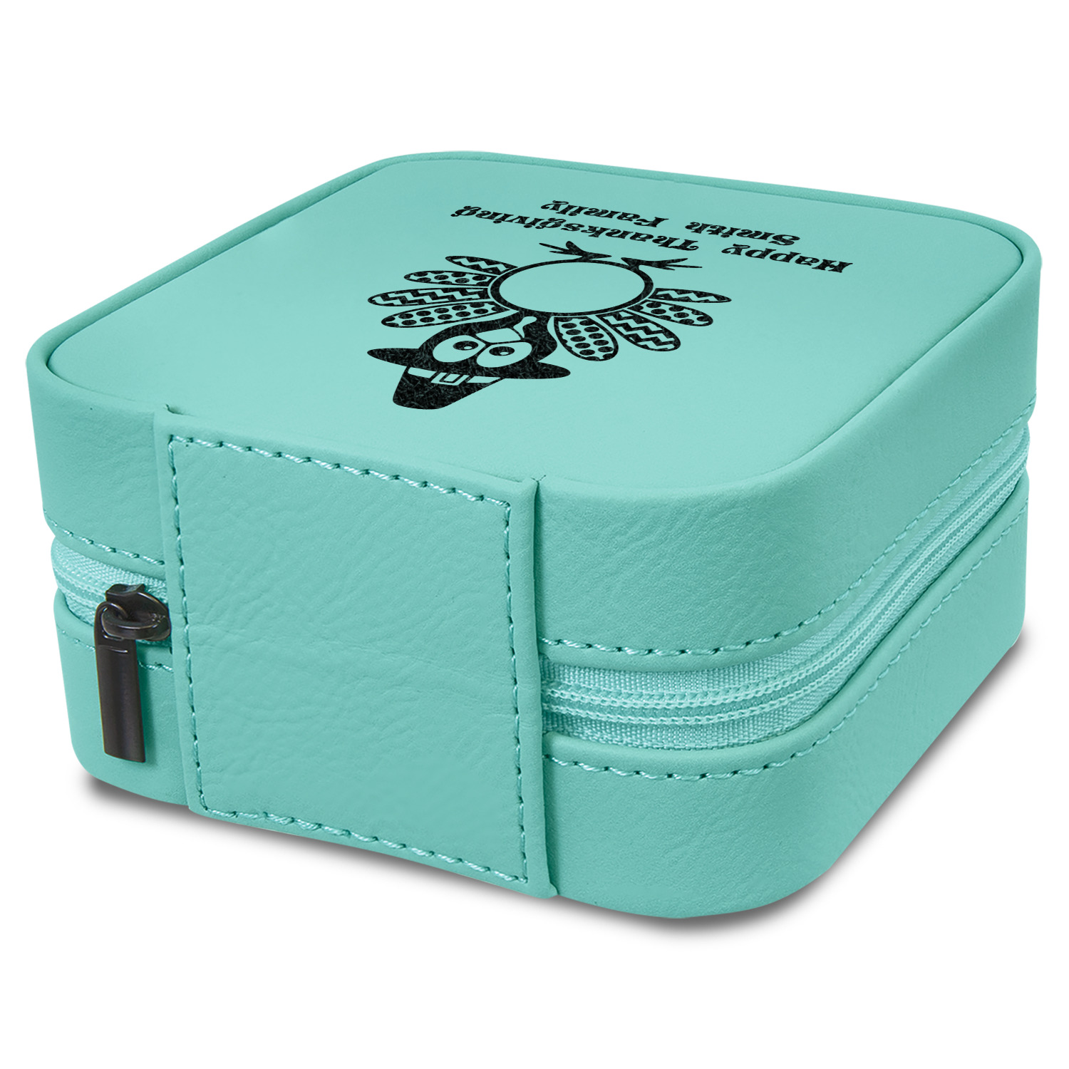 This square zippered travel jewelry box is made from leatherette and is available in four colors - classic cognac / rawhide, a beautiful teal. navy blue or pink. The tan colored soft velvet inside has compartments and hooks for all your jewelry - rings, chains, earrings, bangles etc.