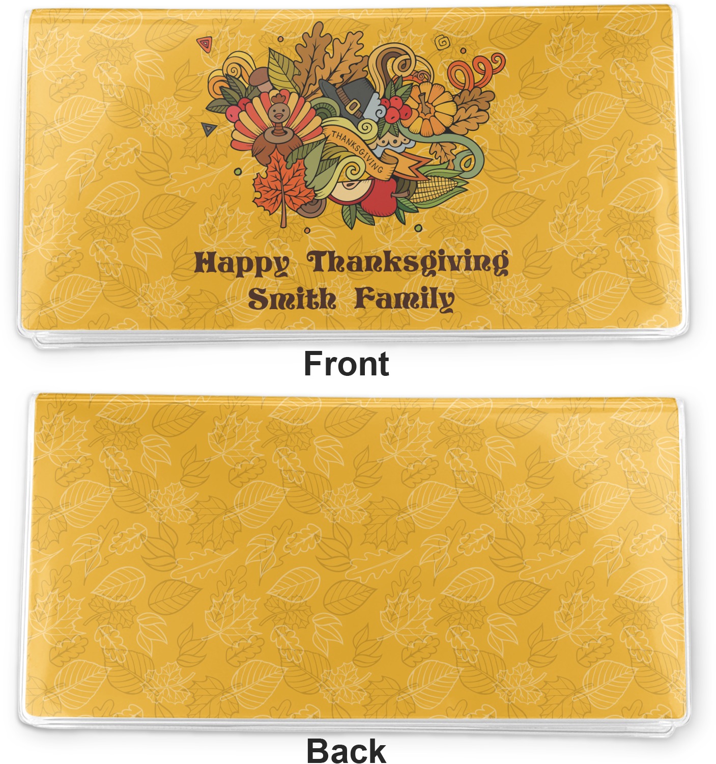Happy Thanksgiving is a retro classic design with all the fall and thanksgiving elements. The background is two tones of leaves on a gold background and it features a hand drawn montage / collage of thanksgiving elements. We chose a retro font and personalized it with "Happy Thanksgiving" and "Smith Family" in a fall / thanksgiving dark brown from our fall/thanksgiving color palette.