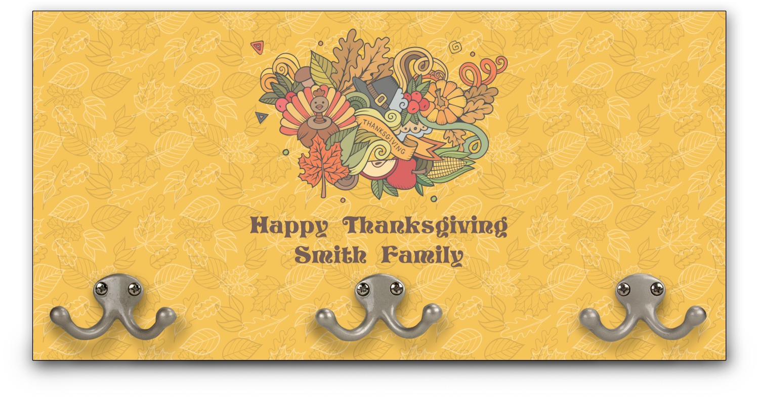 Happy Thanksgiving is a retro classic design with all the fall and thanksgiving elements. The background is two tones of leaves on a gold background and it features a hand drawn montage / collage of thanksgiving elements. We chose a retro font and personalized it with "Happy Thanksgiving" and "Smith Family" in a fall / thanksgiving dark brown from our fall/thanksgiving color palette.