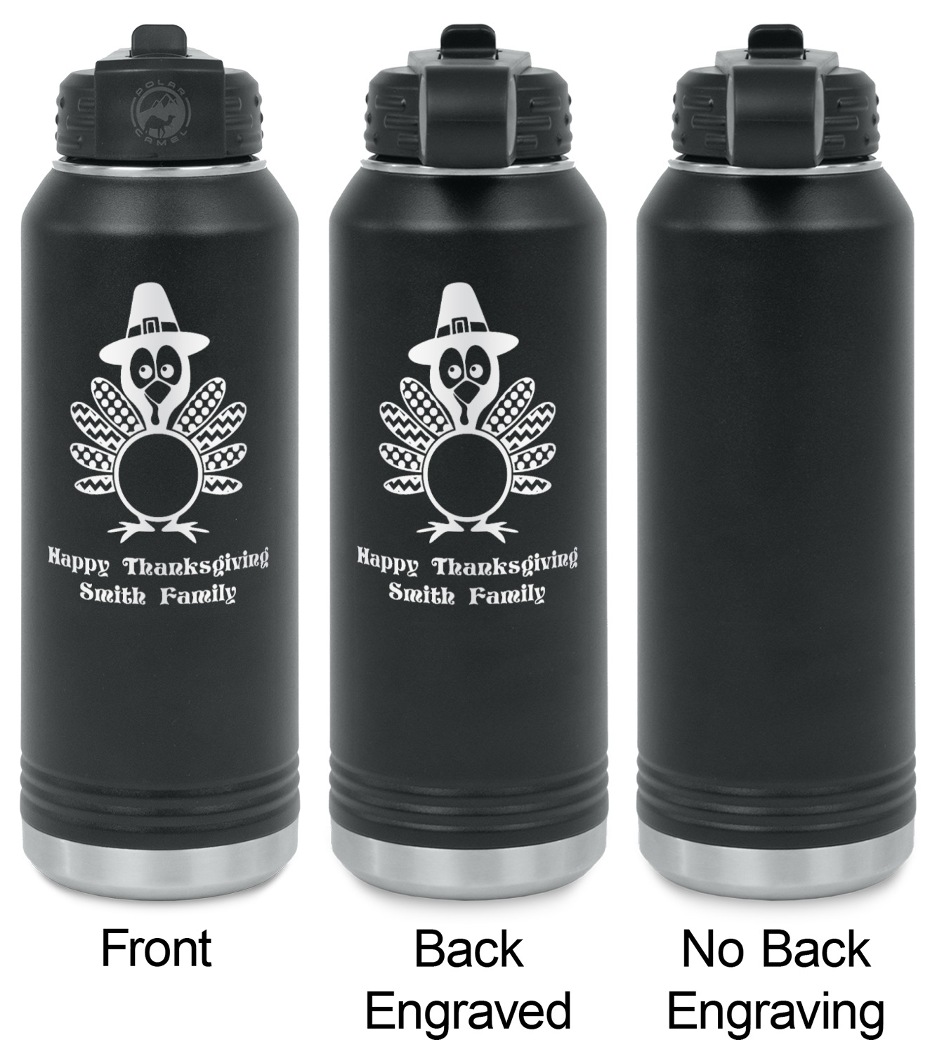 Your design is laser engraved on the water bottles. The engraving removes the black powder coating in the designed area to expose the silver stainless steel underneath.