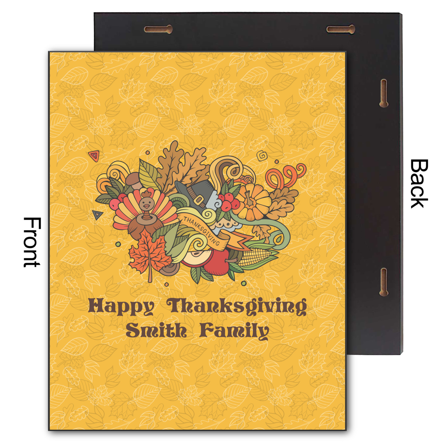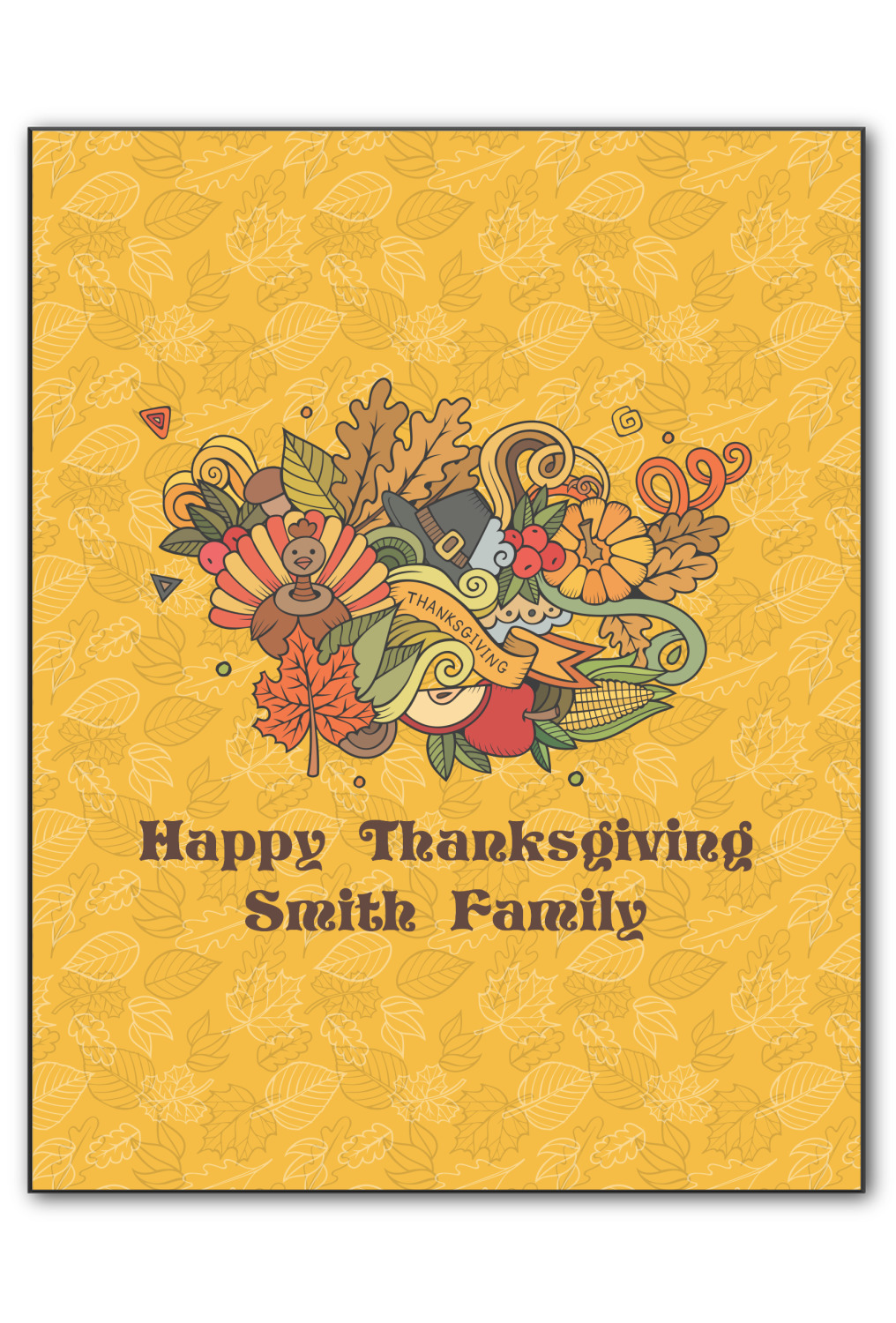 Happy Thanksgiving is a retro classic design with all the fall and thanksgiving elements. The background is two tones of leaves on a gold background and it features a hand drawn montage / collage of thanksgiving elements. We chose a retro font and personalized it with "Happy Thanksgiving" and "Smith Family" in a fall / thanksgiving dark brown from our fall/thanksgiving color palette.
