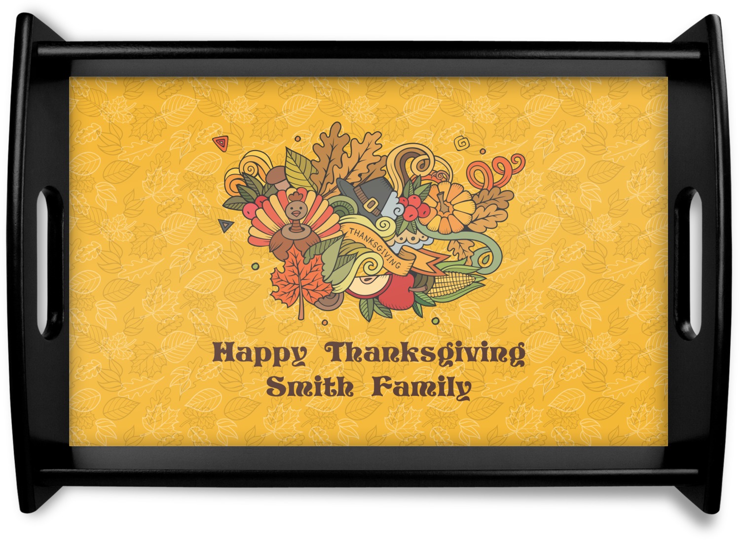 This serving tray with handles features square edges and two rounded sides, creating a very modern look. Each side is fabricated from a beautifully cut, natural wood. The bottom of the interior of the tray displays your customized design in bright, vibrant color. The tray is sold in both a black color and a natural wood look. Each variation of the wood serving tray has two sizes: Small, which is 14" x 10" x 2.25", and Large, which is 19.5" x 13.5" x 2.75".