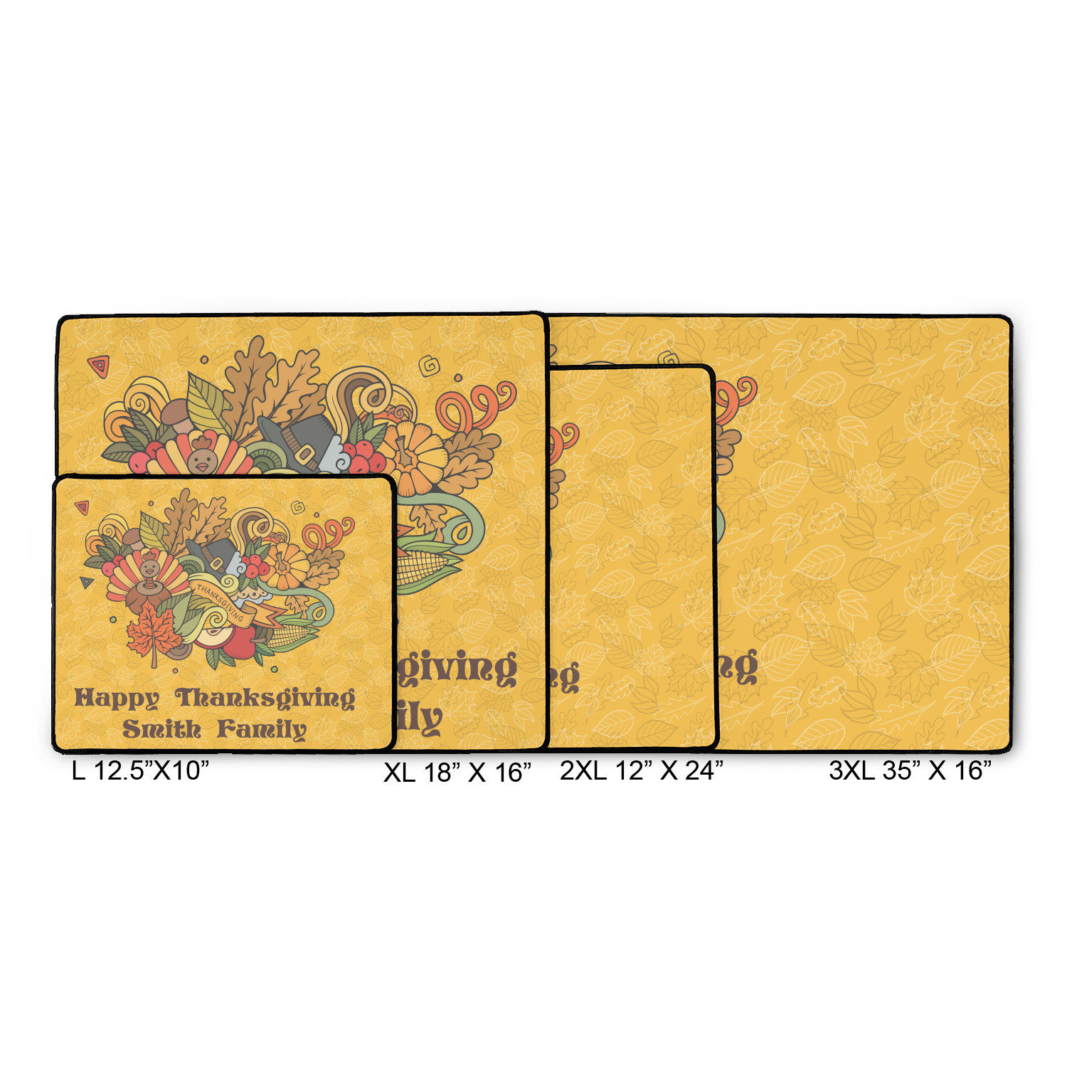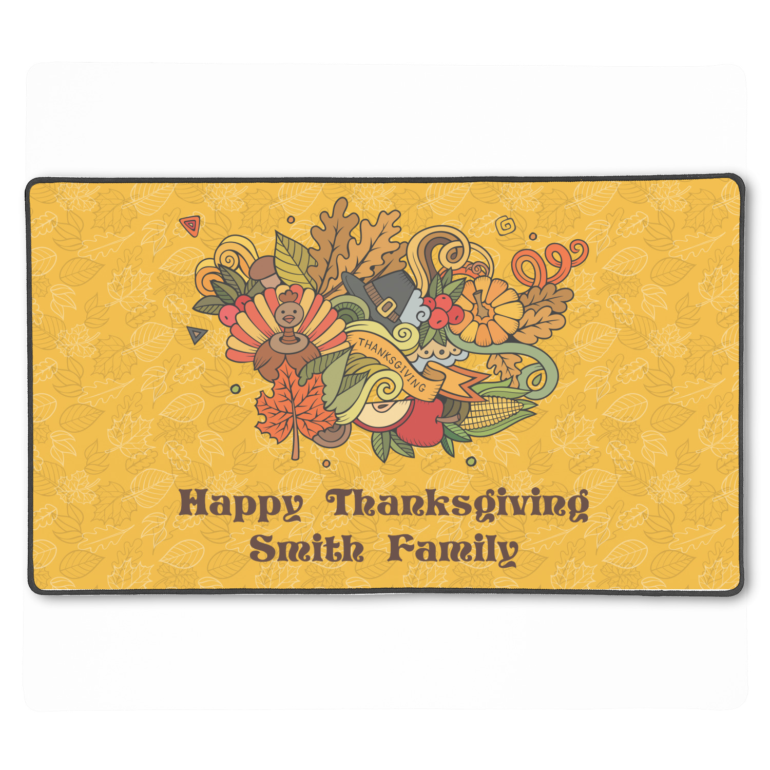 Happy Thanksgiving is a retro classic design with all the fall and thanksgiving elements. The background is two tones of leaves on a gold background and it features a hand drawn montage / collage of thanksgiving elements. We chose a retro font and personalized it with "Happy Thanksgiving" and "Smith Family" in a fall / thanksgiving dark brown from our fall/thanksgiving color palette.