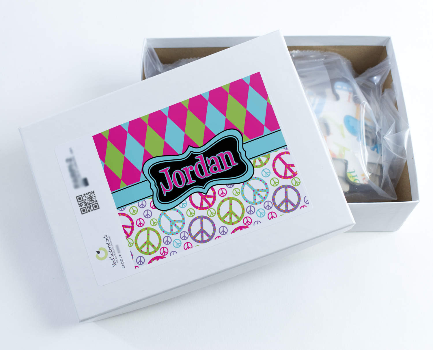 The Harlequin and Peace Signs Design is sure a nice throw back to the 70s. The retro design features harlequin print on the top half in hot pink, lime and light teal. The bottom half is colorful peace signs in the same color scheme on a black background. The larger peace signs have fun polka dots and are surrounded by smaller solid colored peace signs.