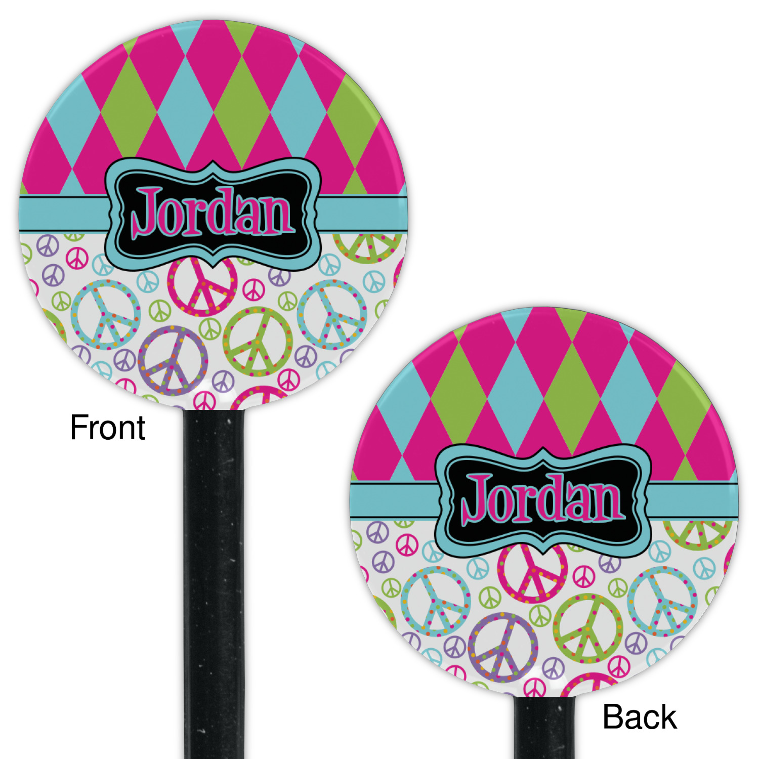 The Harlequin and Peace Signs Design is sure a nice throw back to the 70s. The retro design features harlequin print on the top half in hot pink, lime and light teal. The bottom half is colorful peace signs in the same color scheme on a black background. The larger peace signs have fun polka dots and are surrounded by smaller solid colored peace signs.
