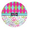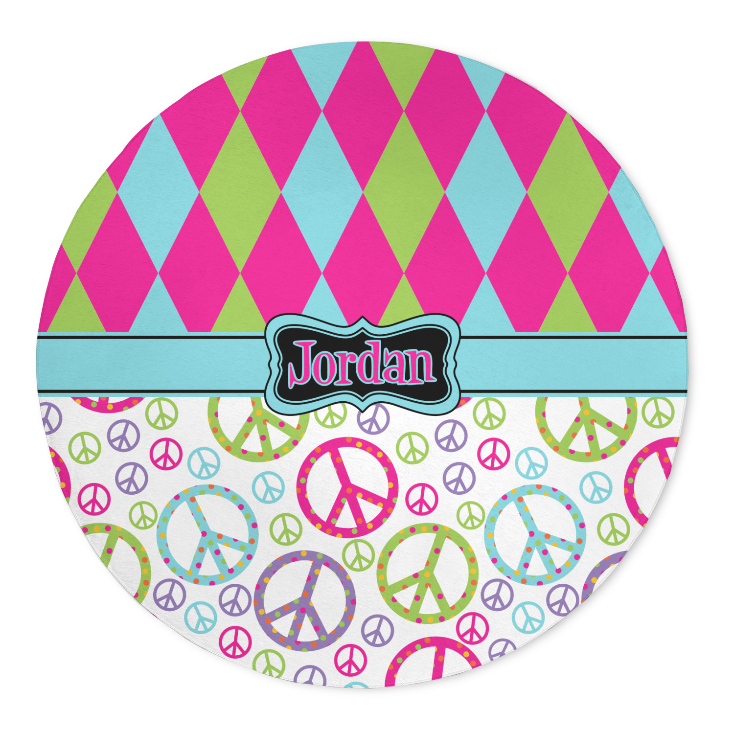 The Harlequin and Peace Signs Design is sure a nice throw back to the 70s. The retro design features harlequin print on the top half in hot pink, lime and light teal. The bottom half is colorful peace signs in the same color scheme on a black background. The larger peace signs have fun polka dots and are surrounded by smaller solid colored peace signs.