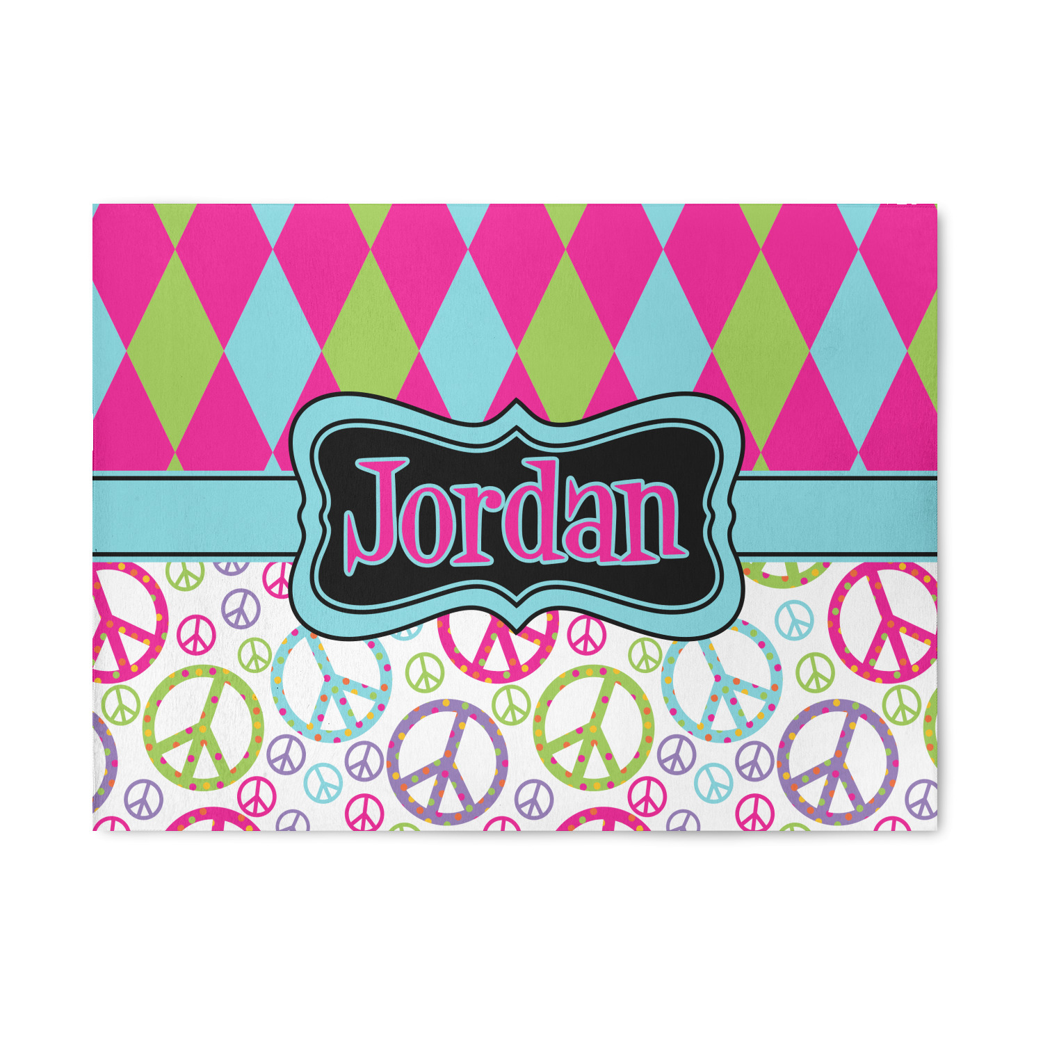 The Harlequin and Peace Signs Design is sure a nice throw back to the 70s. The retro design features harlequin print on the top half in hot pink, lime and light teal. The bottom half is colorful peace signs in the same color scheme on a black background. The larger peace signs have fun polka dots and are surrounded by smaller solid colored peace signs.