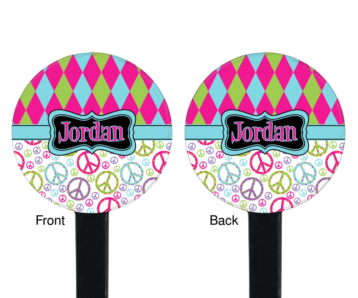 The Harlequin and Peace Signs Design is sure a nice throw back to the 70s. The retro design features harlequin print on the top half in hot pink, lime and light teal. The bottom half is colorful peace signs in the same color scheme on a black background. The larger peace signs have fun polka dots and are surrounded by smaller solid colored peace signs.