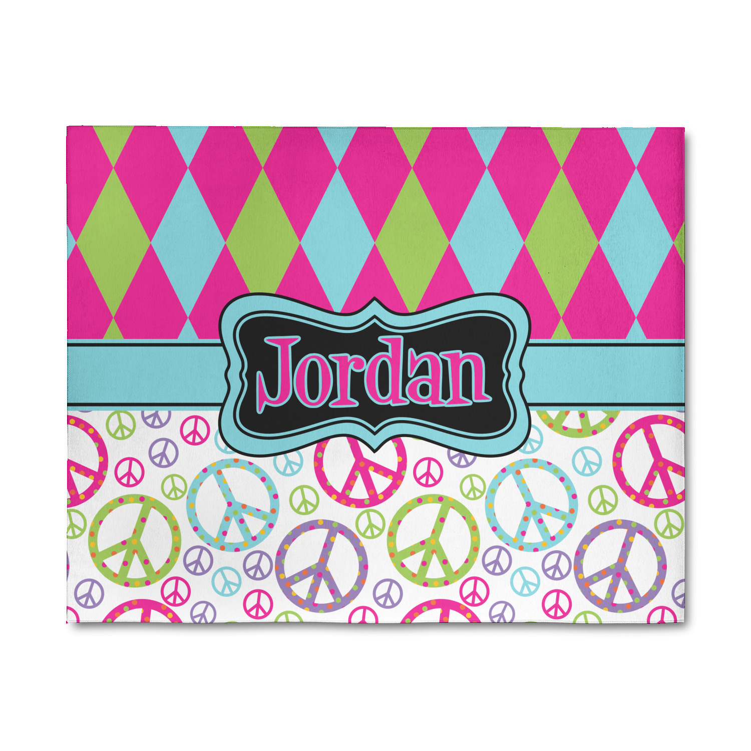 The Harlequin and Peace Signs Design is sure a nice throw back to the 70s. The retro design features harlequin print on the top half in hot pink, lime and light teal. The bottom half is colorful peace signs in the same color scheme on a black background. The larger peace signs have fun polka dots and are surrounded by smaller solid colored peace signs.