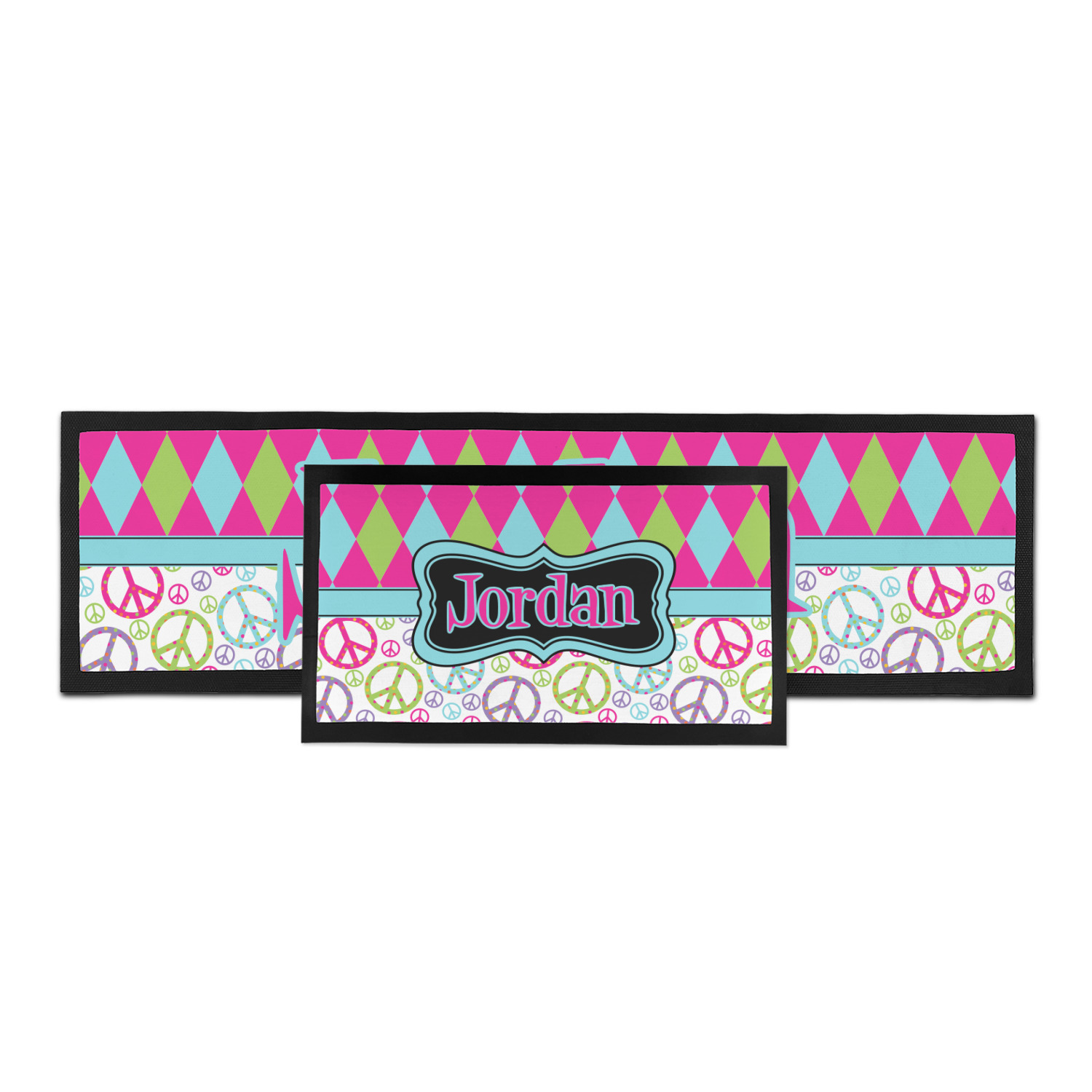 The Harlequin and Peace Signs Design is sure a nice throw back to the 70s. The retro design features harlequin print on the top half in hot pink, lime and light teal. The bottom half is colorful peace signs in the same color scheme on a black background. The larger peace signs have fun polka dots and are surrounded by smaller solid colored peace signs.
