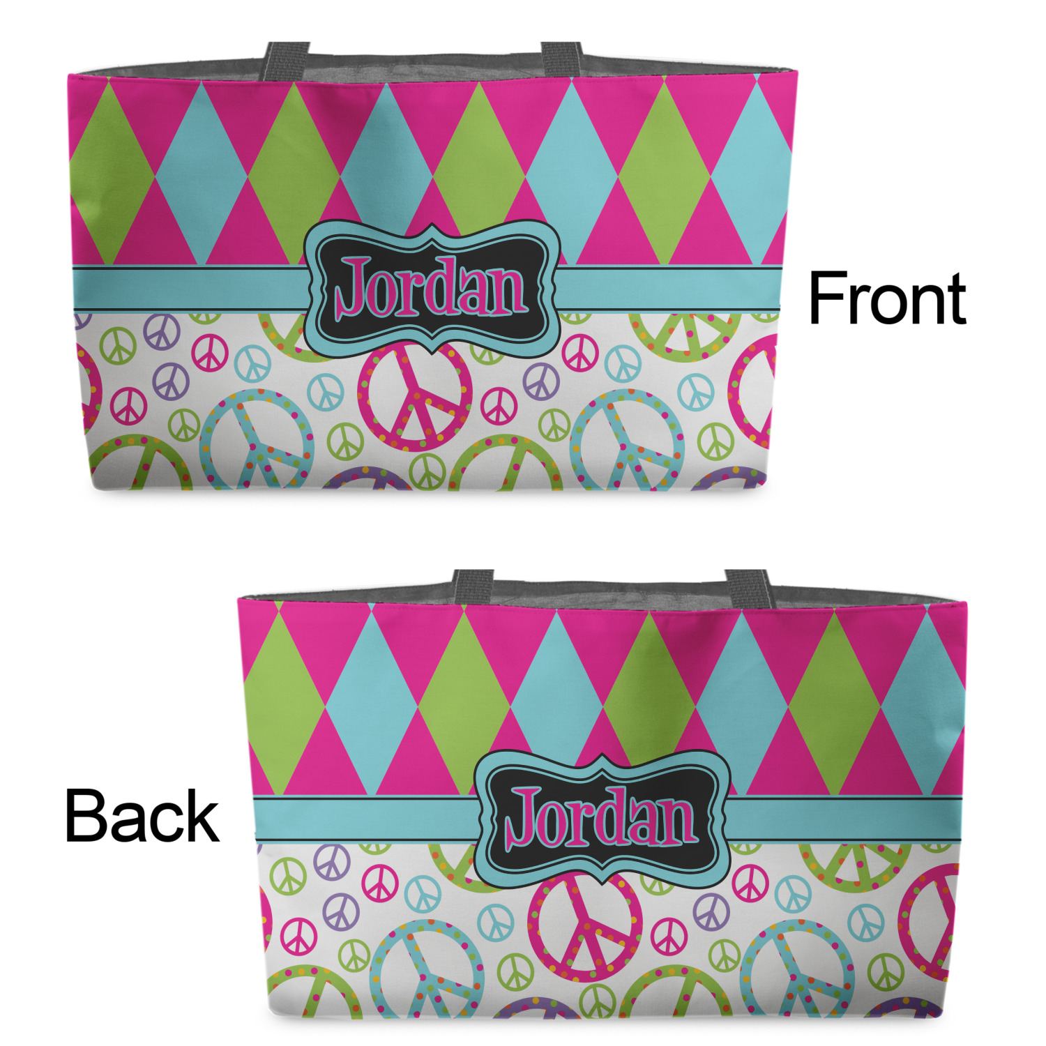You can design the totes with a design on the front and another one on the back. The two designs can be identical or completely different. The choice is yours.