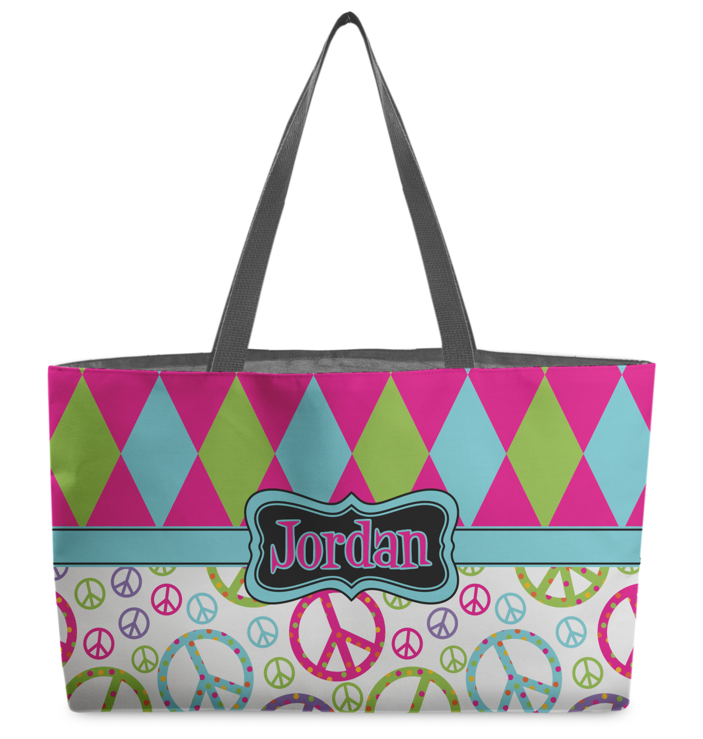 These beach totes are handmade here in the USA. Fabric is printed with your design. The tote is then sewn from the fabric pieces, lining and handles added.
