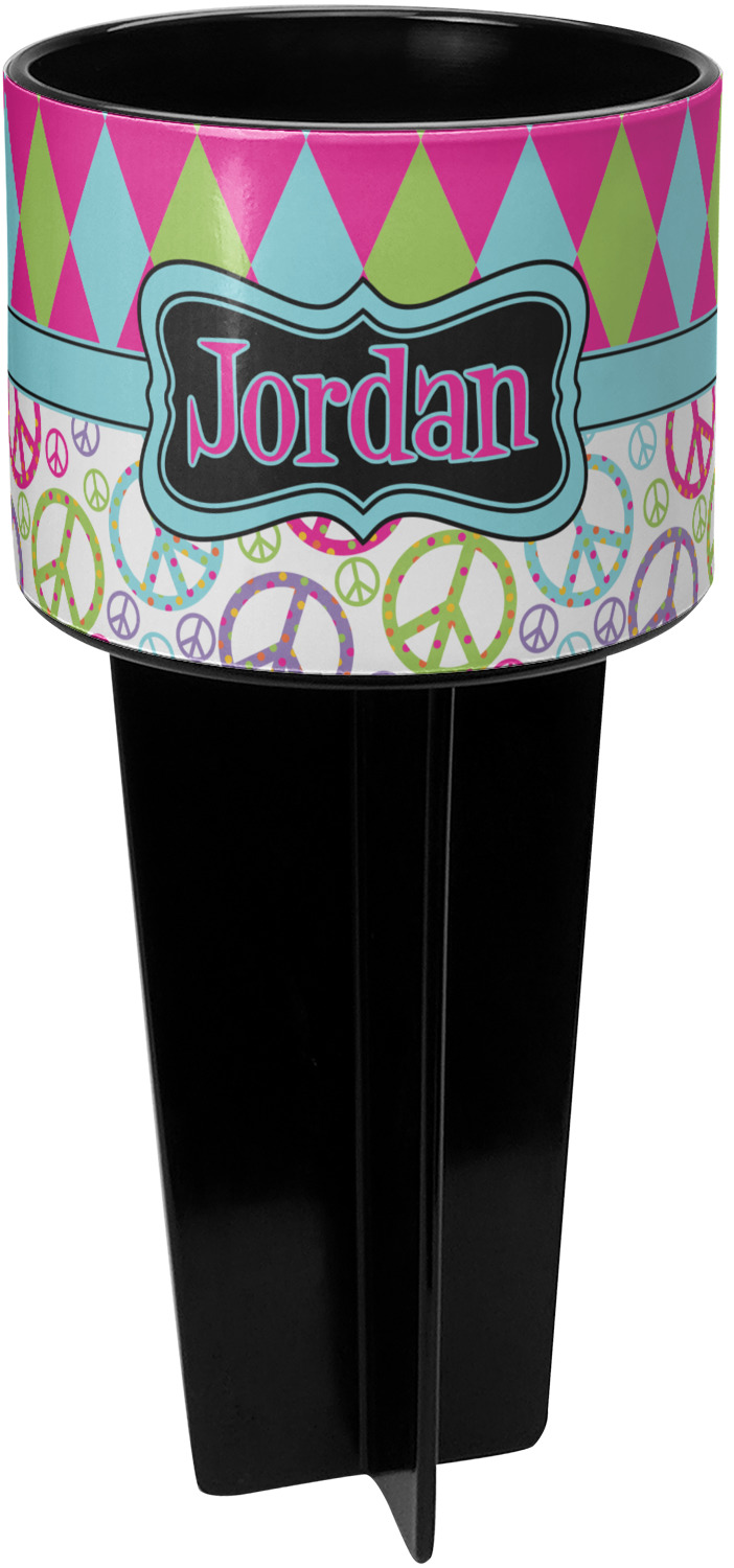 This cup holder has a large stake at its bottom that anchors it to the sand or ground below, while the cup holder rests above the stake. The entire drink holder is made of durable plastic and displays your customization around the cup holder portion. We sell these personalized beach spikers in two different colors: black and white.